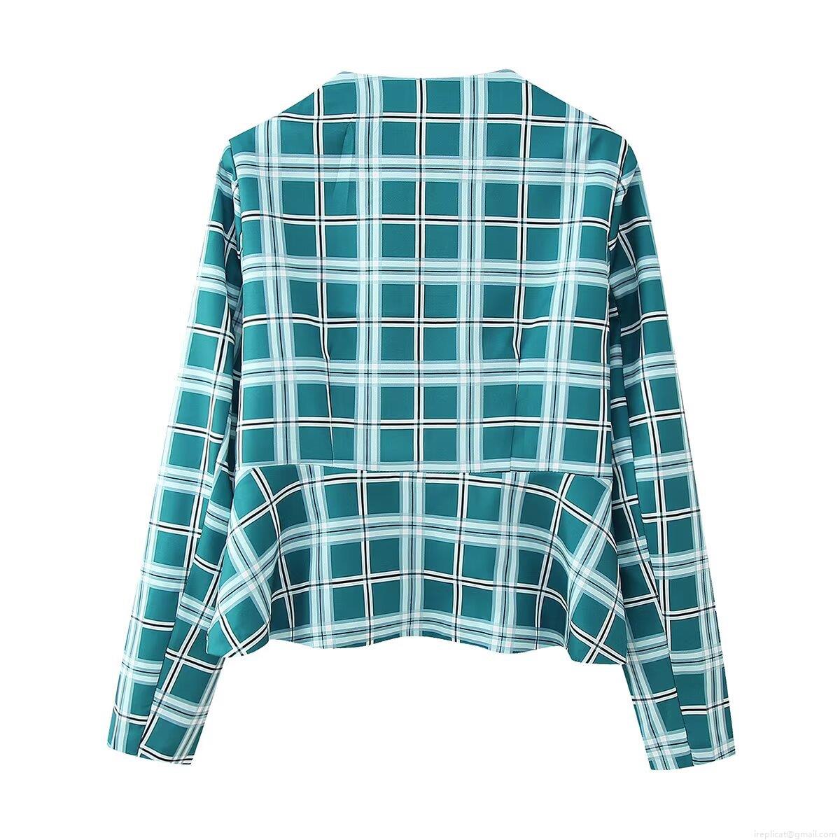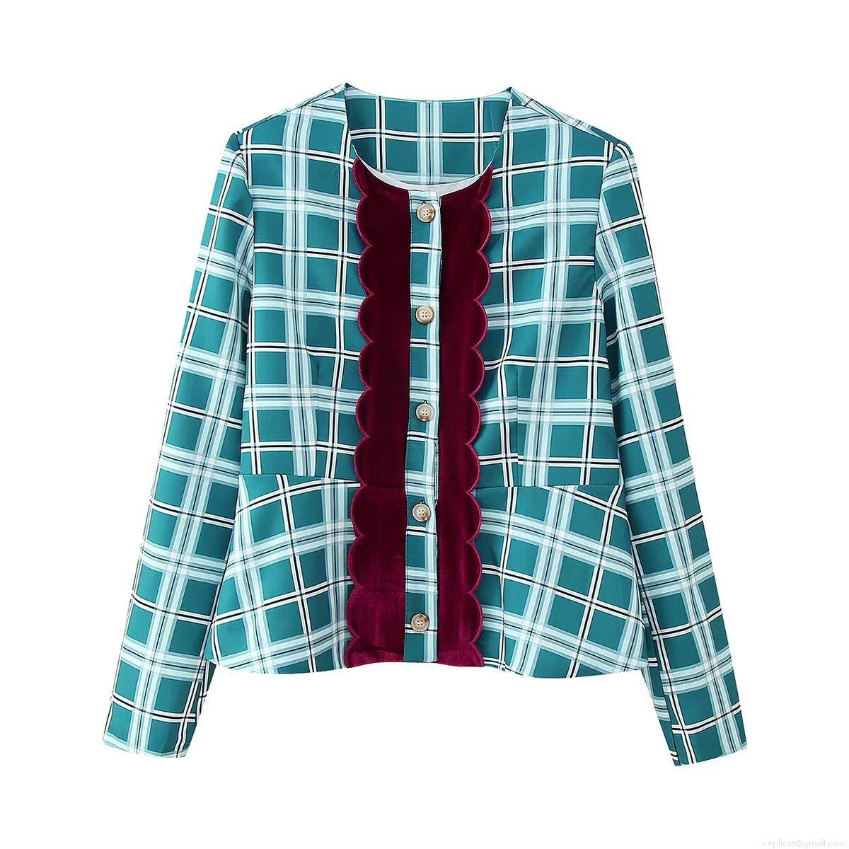 Color Blocking, Large Plaid, Velvet Wavy Edge, Peplum Ruffle Hem, Imitation Wood Buttons