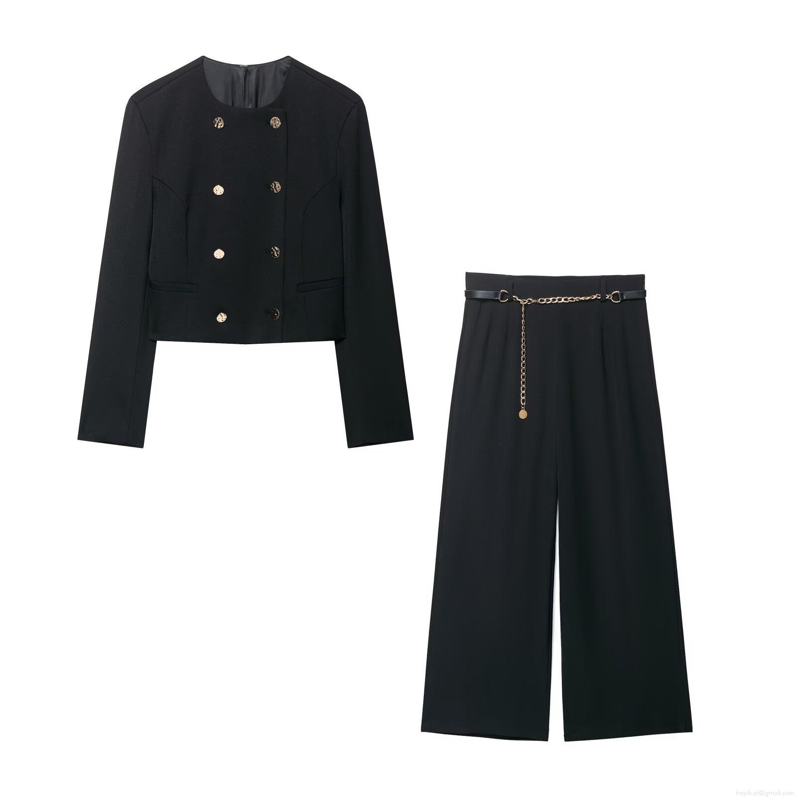 • Women Double Breasted Short Blazer And Wide Leg Pants 2 Piece Set With Metal Chain Belt Solid Color High Waist Suit For Streetwear Office Party Casual Outfits