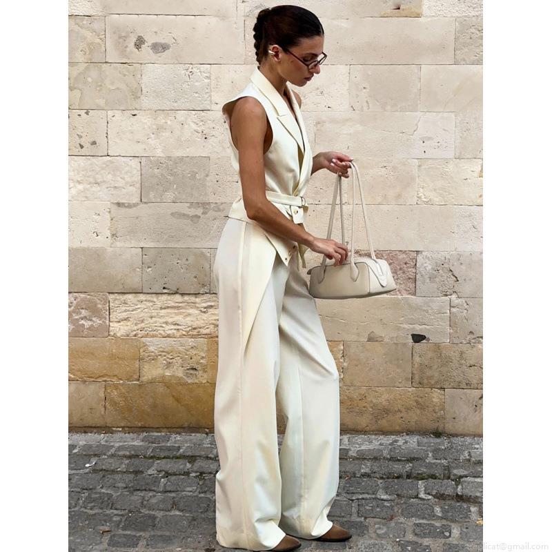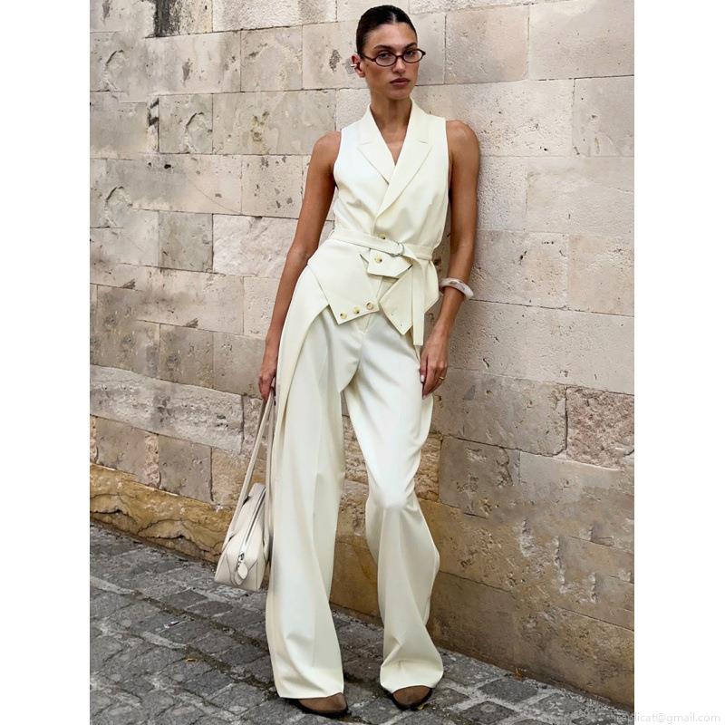 • Women Elegant 2 Piece Sleeveless Blazer Vest And Wide Leg Pants Set Solid Color Polyester Commuter Waistcoat Trousers Suit With Belt