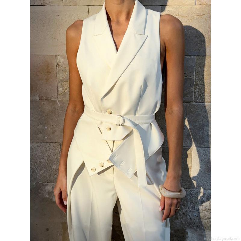 Solid Color, Belt Decoration, Wide-leg Pants, Suit Collar, Sleeveless Design, Waist Tie