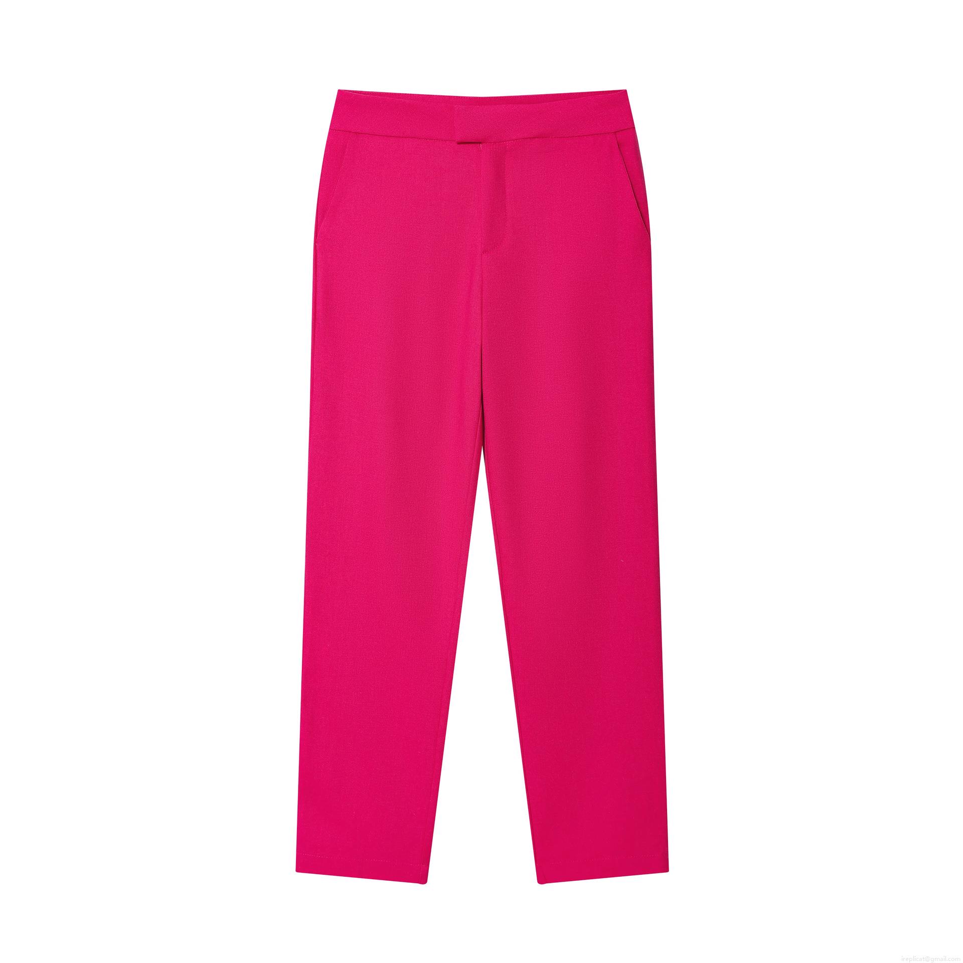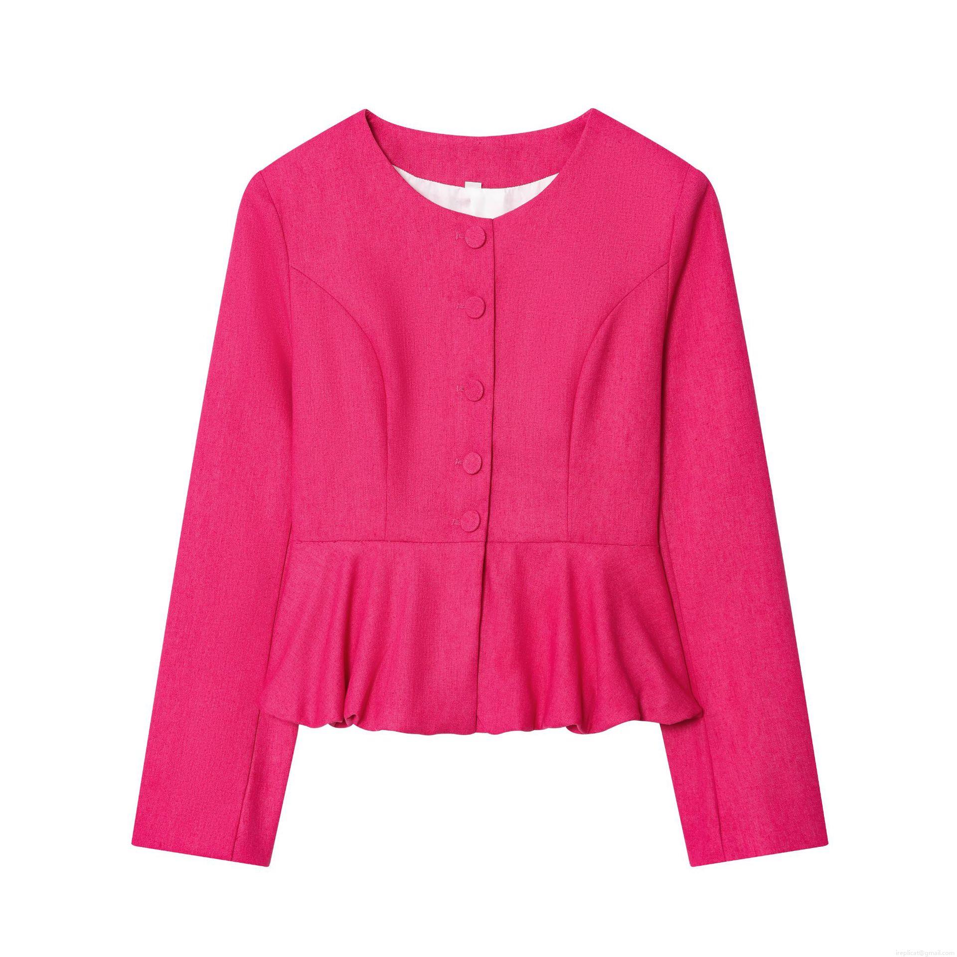 • Women Elegant Fuchsia Two Piece Set Round Neck Peplum Short Blazer And High Waist Slim Straight Leg Pants Solid Color Casual Office Suit Streetwear
