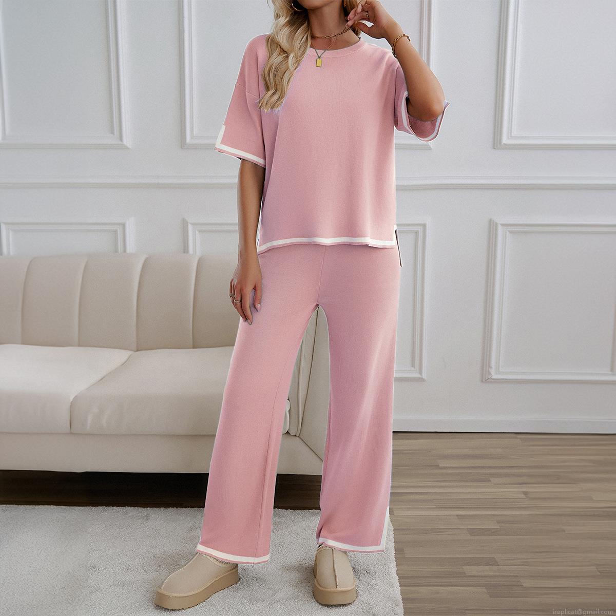 • Women Elegant Knit Two-Piece Set Casual Short Sleeve Top And Wide Leg Pants With Contrast Piping Trim Loungewear Suit For Commuting Daily Wear