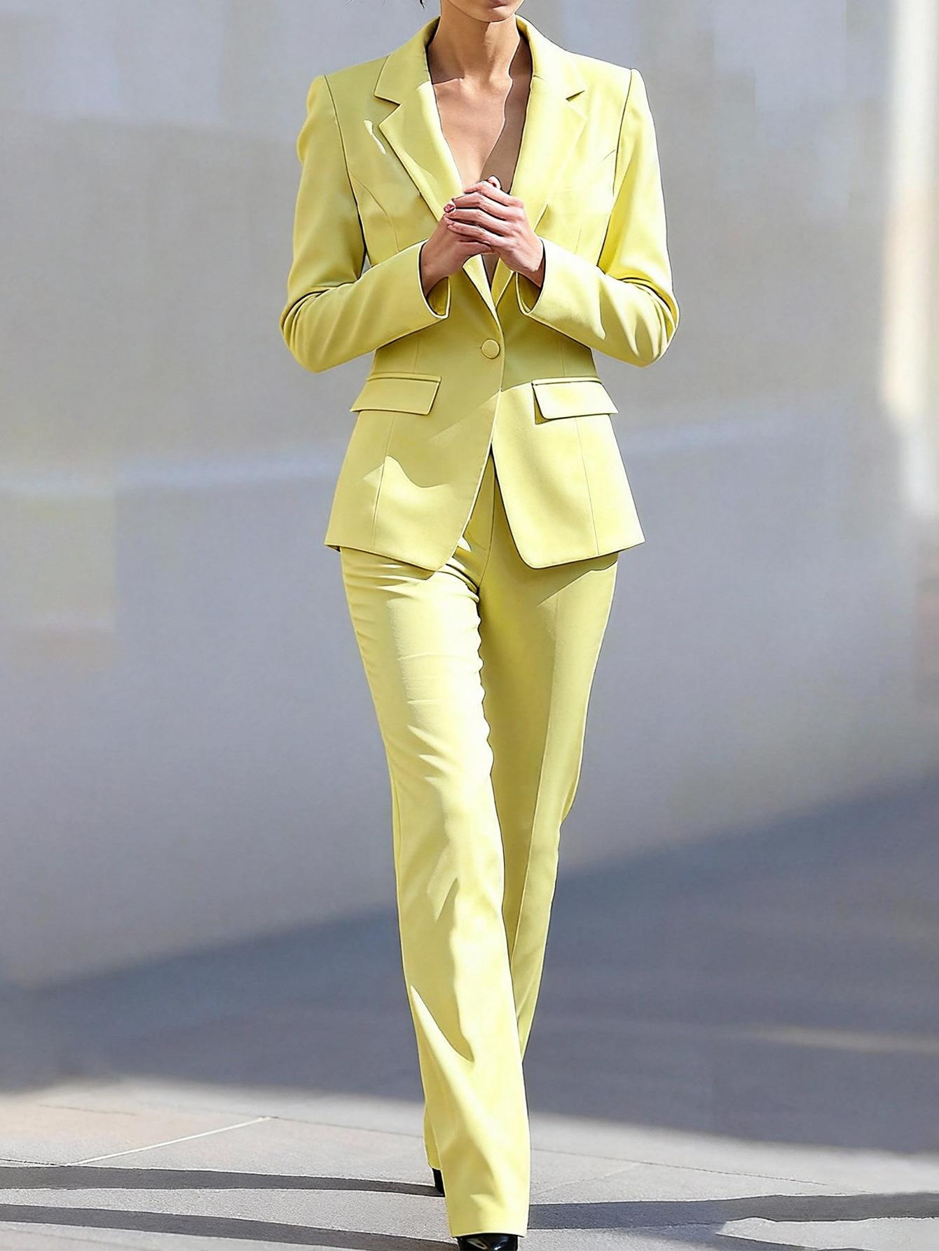 • Women Elegant Light Yellow 2-Piece Blazer Suit Set Slim Fit Notched Lapel Single Button Blazer with Straight Leg Pants Office Business Commuting Lady Outfit