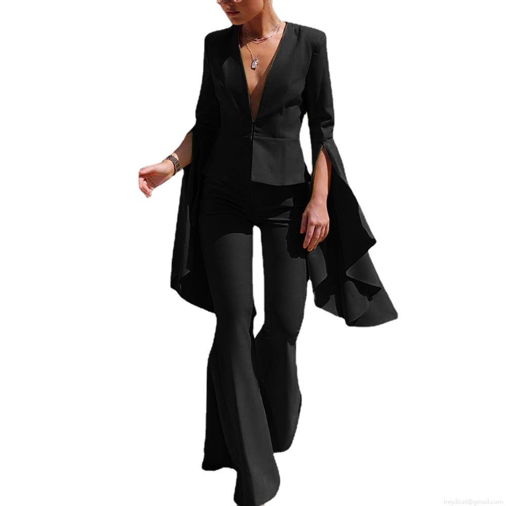 • Women Elegant Two Piece Suit Set Deep V-Neck Flare Sleeve Jacket Top High Waist Flare Pants Set Solid Color Professional Office Commute Evening Party Outfit Polyester Spandex Fashion Clothing