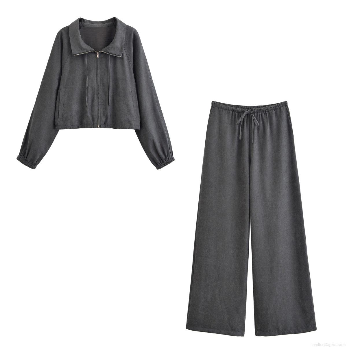 • Women European Style Two Piece Set Suede Texture Short Zipper Jacket And High Waist Wide Leg Drawstring Pants Casual Streetwear 2025 Autumn Outfits