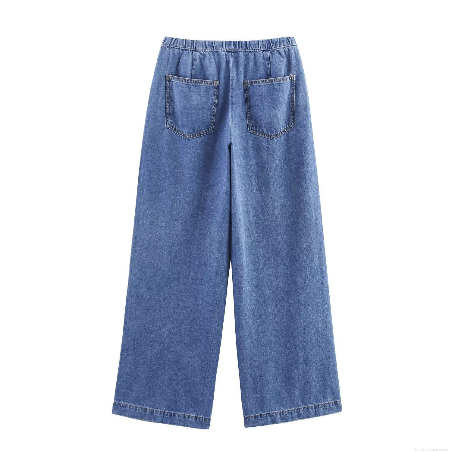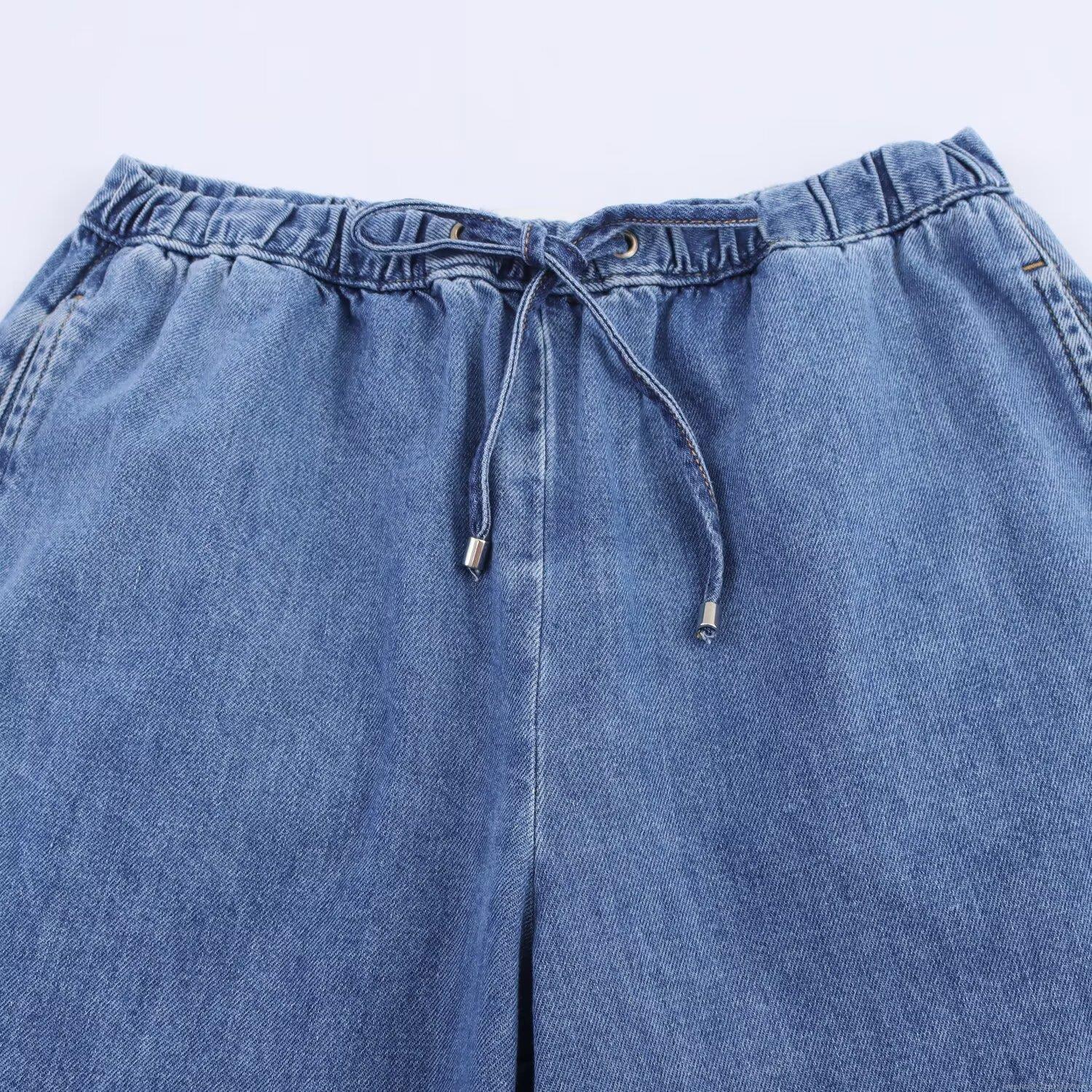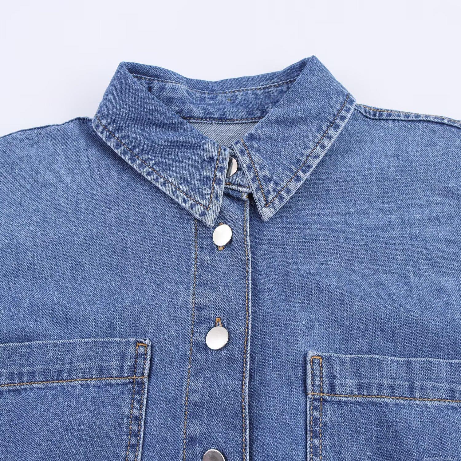 • Women Fashion Casual Denim Two-Piece Set Short Long Sleeve Button Down Blouse Shirt Crop Top And High Waist Drawstring Wide Leg Jogger Pants Separates