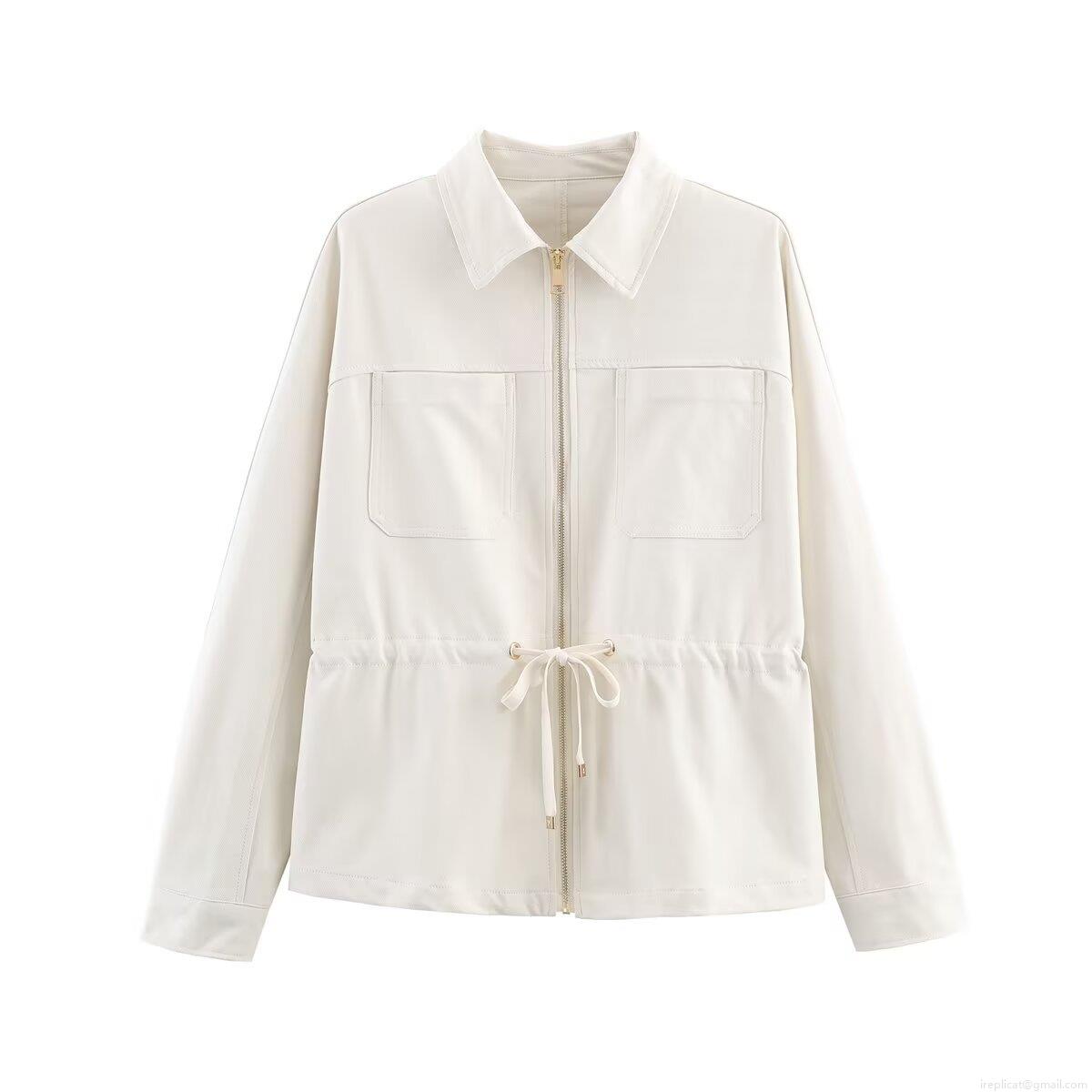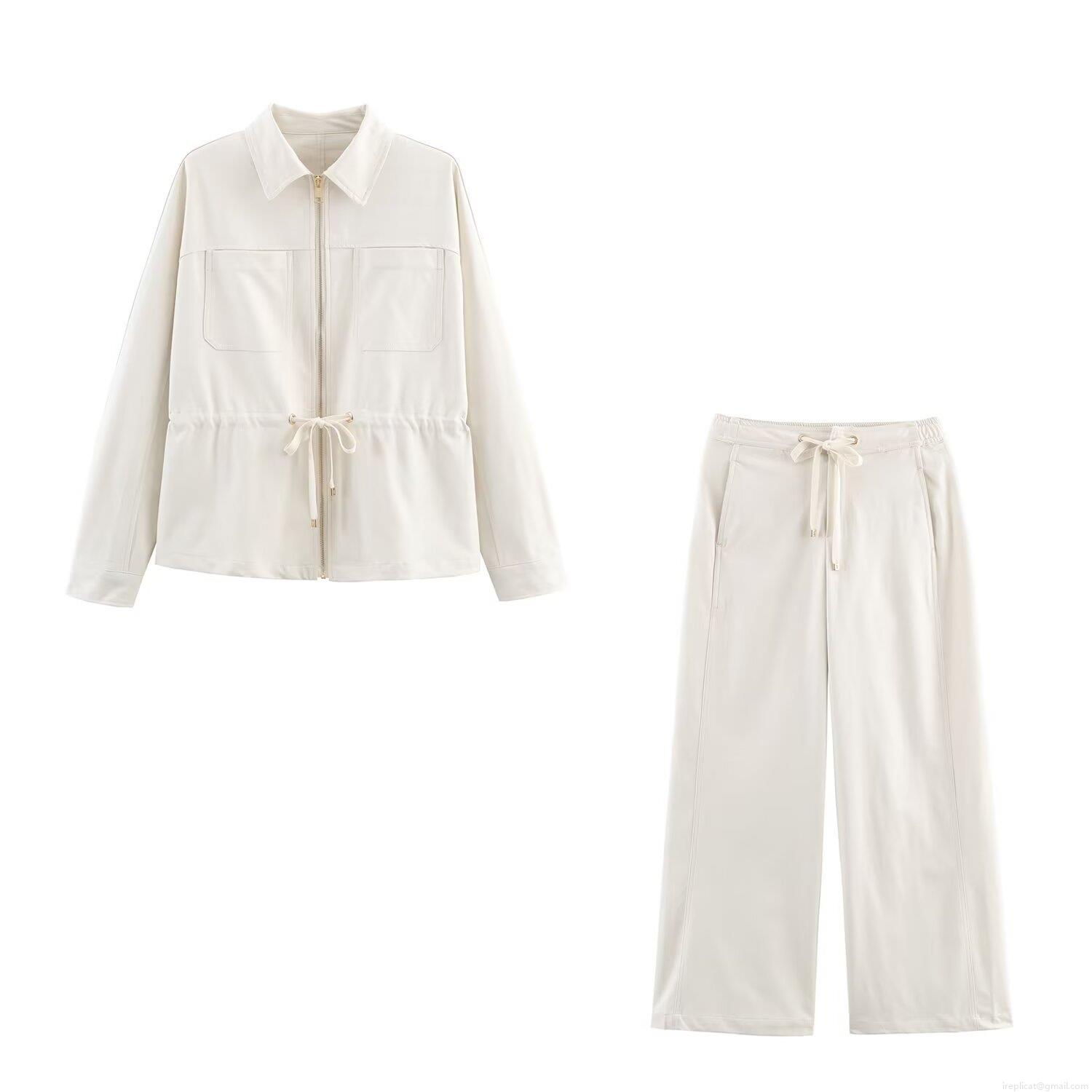 • Women Fashion Casual Polyester 2 Piece Set Solid Color Long Sleeve Lapel Zipper Jacket With Drawstring Waist And Matching Straight Leg Pants Khaki White Autumn Outfit For Streetwear