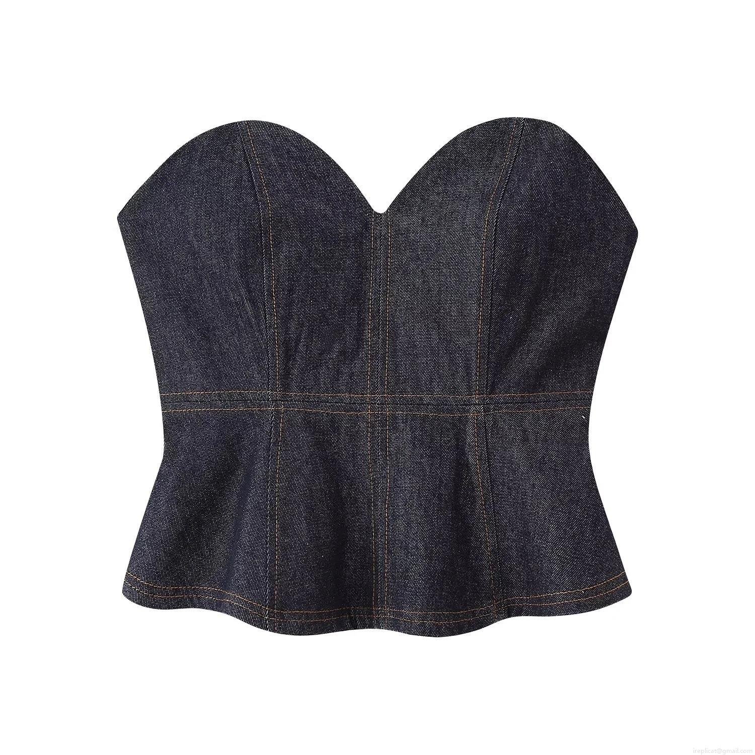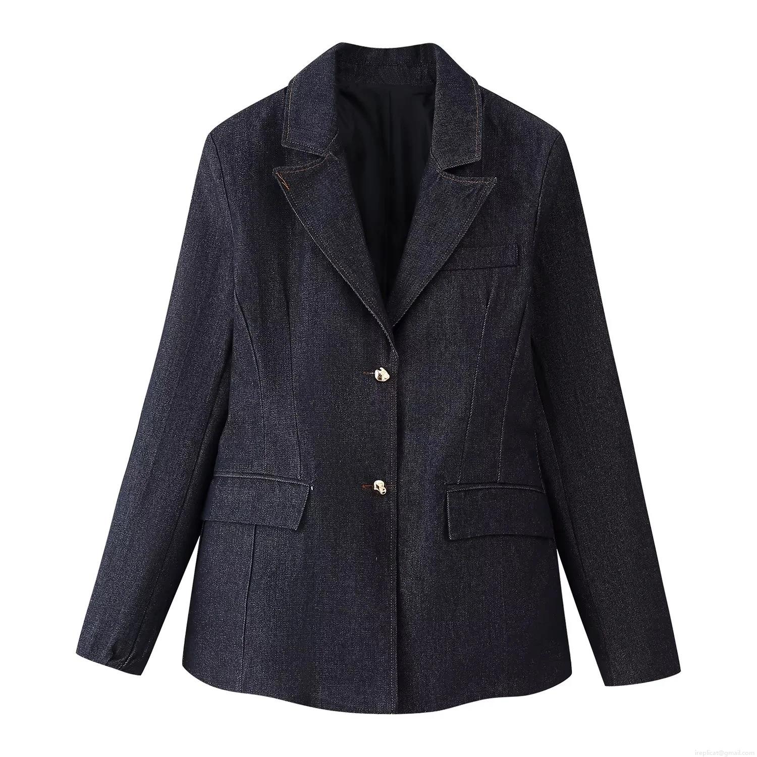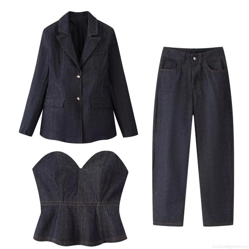 • Women Fashion Dark Blue Denim 3-Piece Set With Blazer Bustier Corset Top And Wide Leg Trousers Casual Streetwear European American Style Indigo Denim Outfits For Women