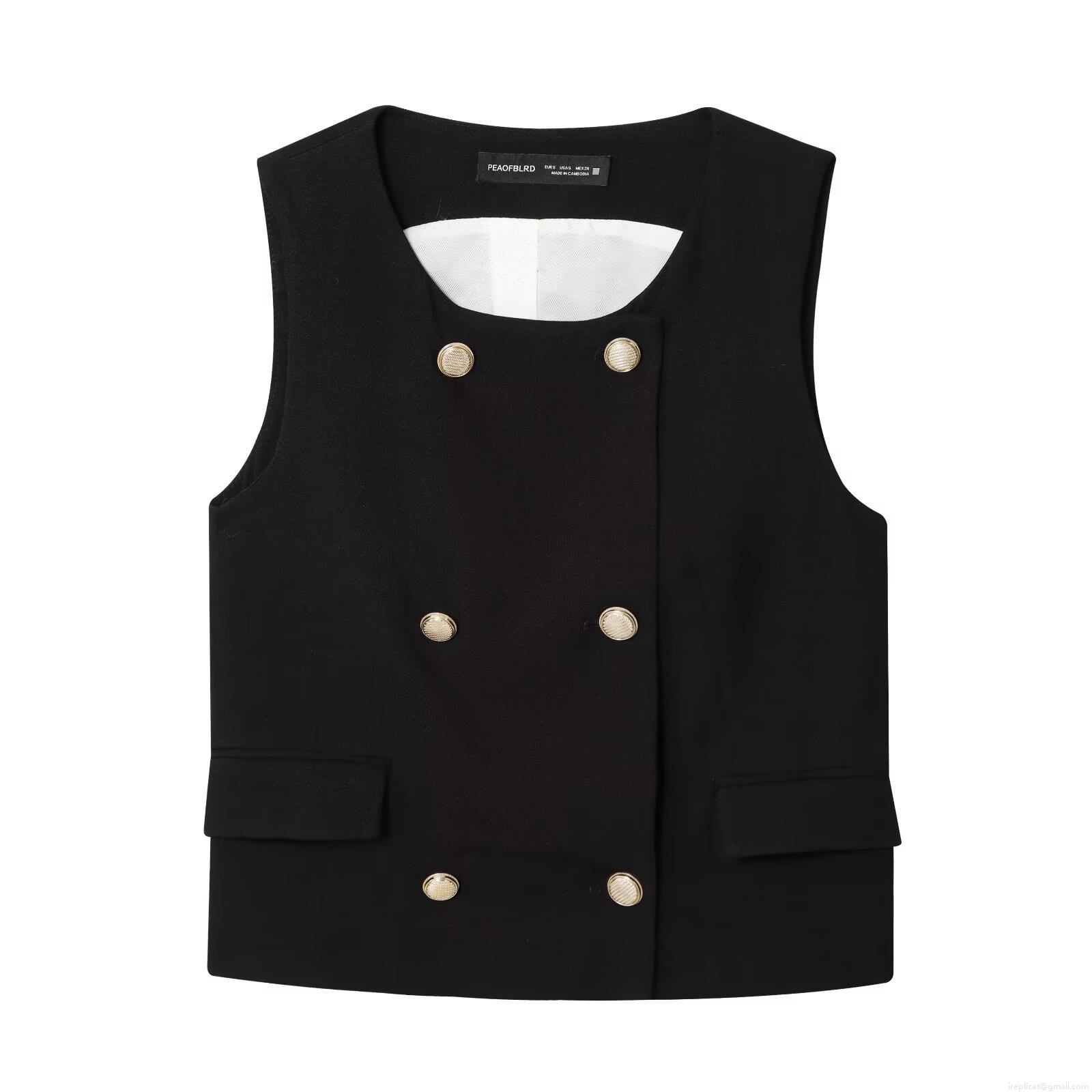 • Women Fashion Double Breasted Vest And Wide Leg Pants Set Elegant Sleeveless Top High Waist Pleated Trousers With Golden Buttons European Style Office Lady Streetwear