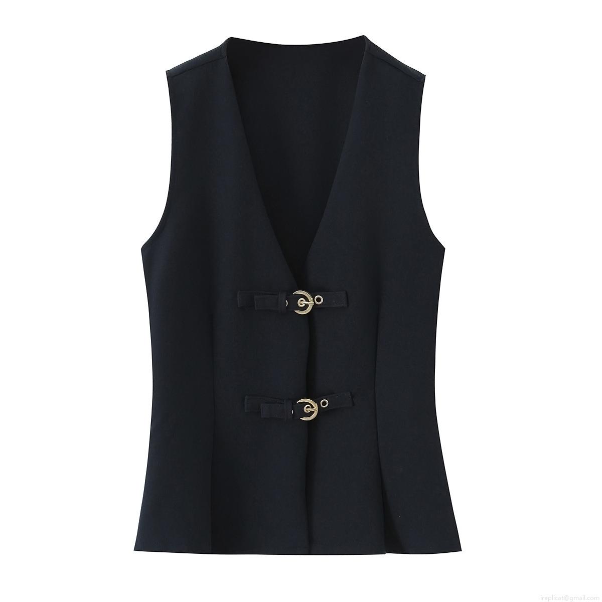 Women Fashion Two Piece Set Sleeveless V Neck Vest With Crescent Buckle High Waist Flare Pants Streetwear Solid Color Autumn Suit