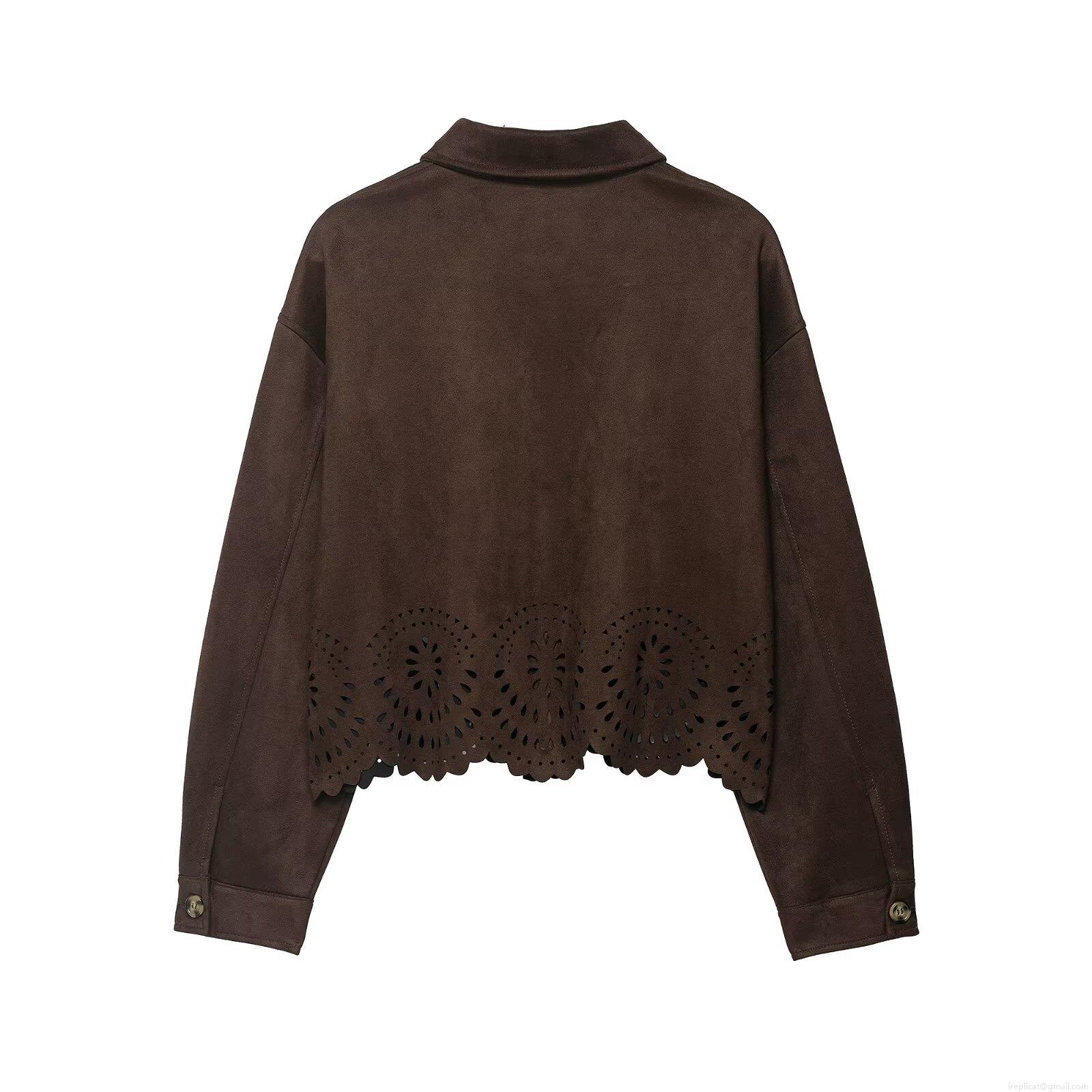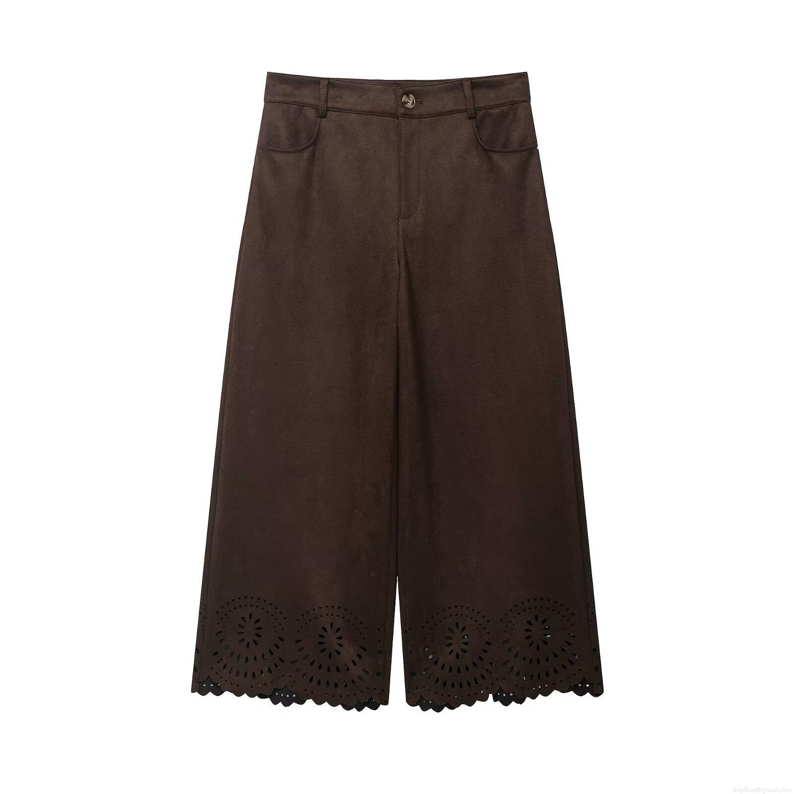 • Women Faux Suede 2 Piece Set Laser Cut Flower Embroidery Crop Jacket And High Waist Wide Leg Pants Vintage Autumn Streetwear Dark Brown Outfits