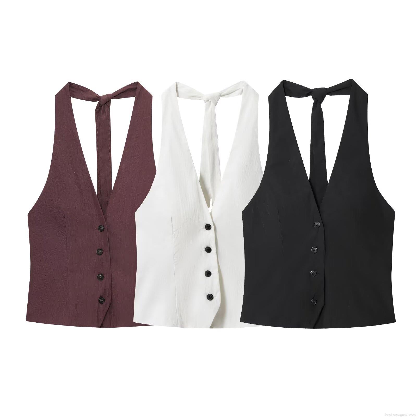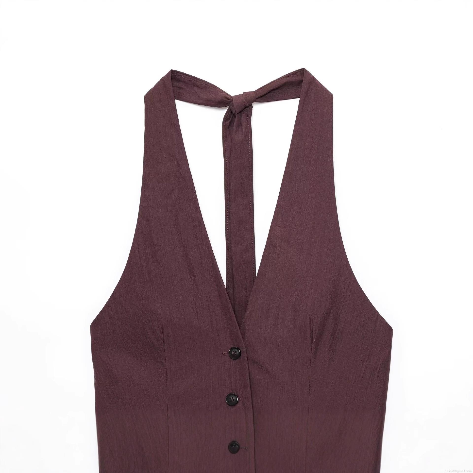 Solid Color, Lace-up Backless, Button Decoration, Pleating Process, Neckband Design