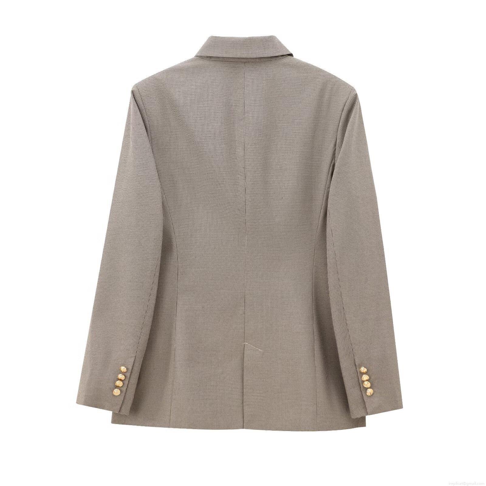 Women Houndstooth Blazer And Wide Leg Pants Two Piece Suit Set Polyester Gold Button Single Breasted Jacket High Waist Trousers Streetwear Office Lady