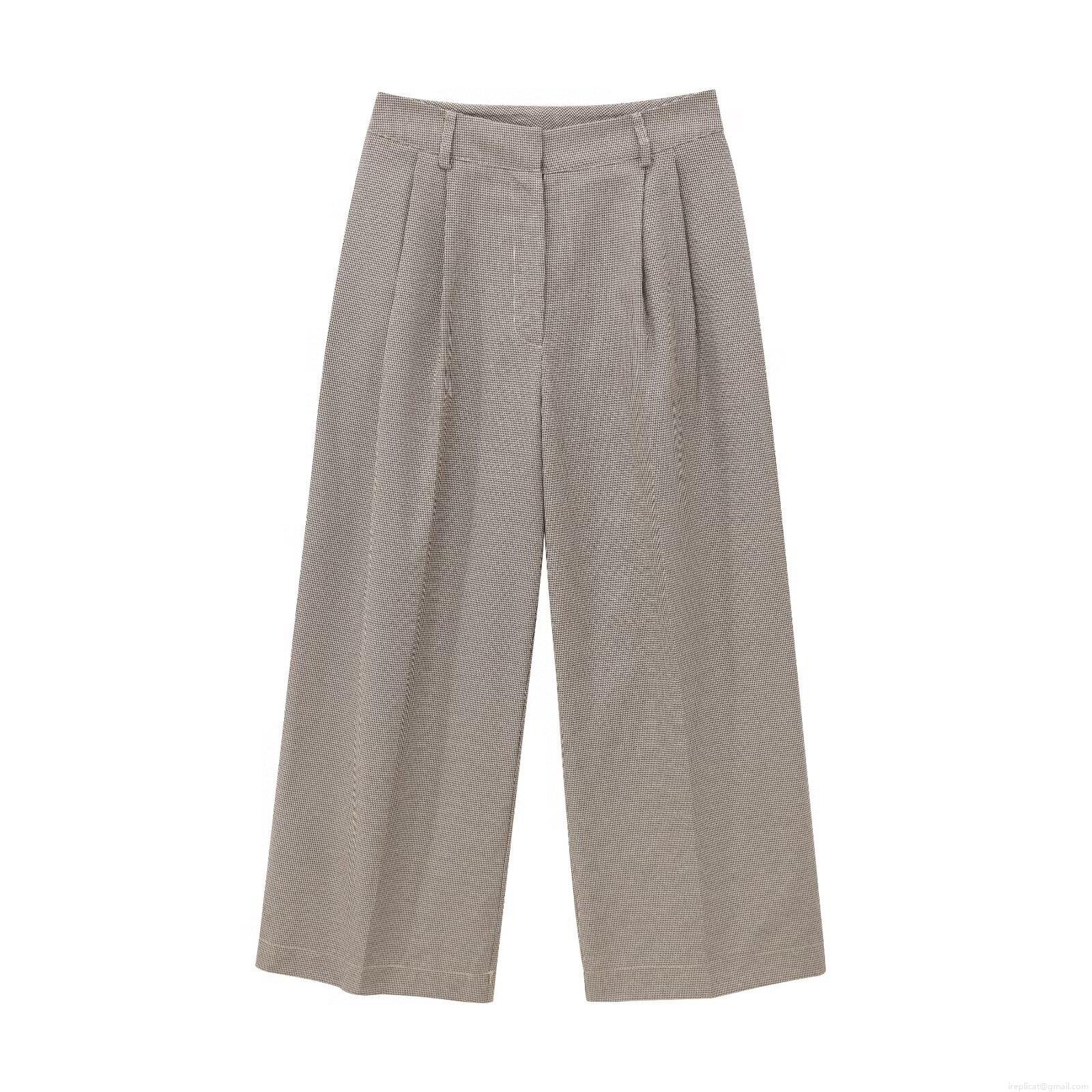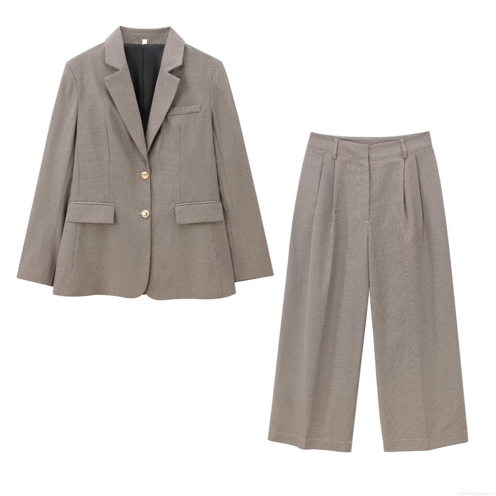 • Women Houndstooth Blazer And Wide Leg Pants Two Piece Suit Set Polyester Gold Button Single Breasted Jacket High Waist Trousers Streetwear Office Lady