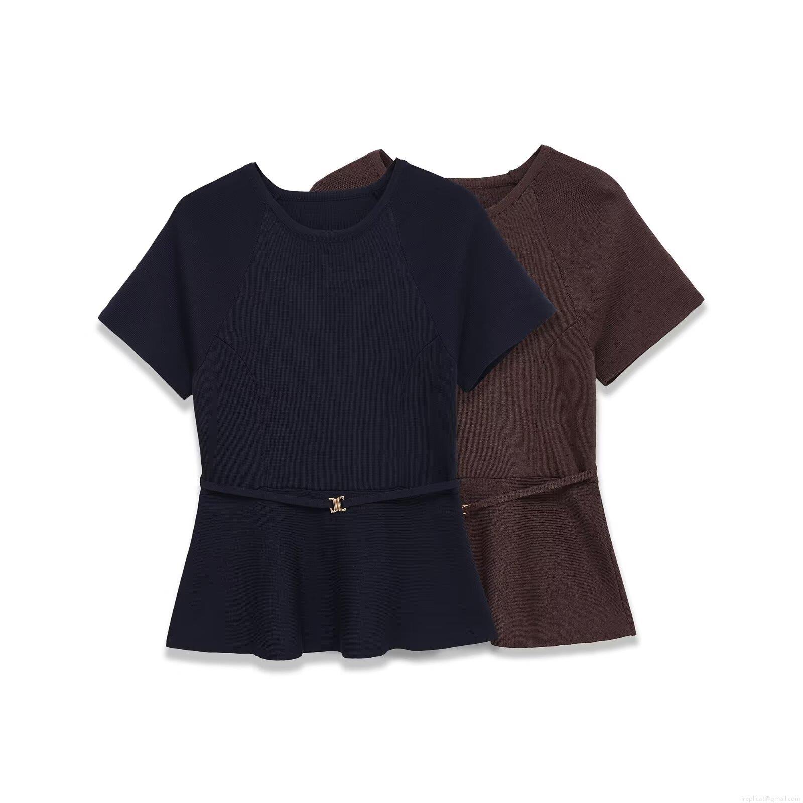 • Women Knit Two Piece Set Fashion Peplum Short Sleeve Top With Belt and High Waist Flared Pants Solid Color Casual Streetwear Outfit