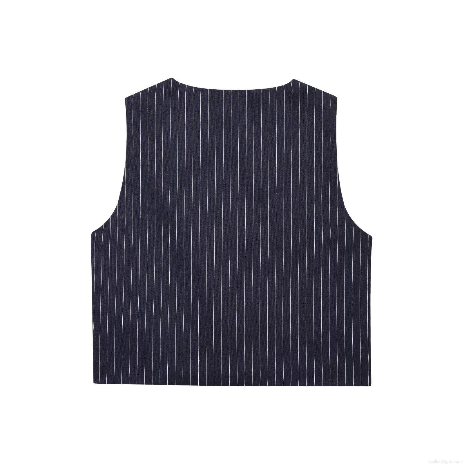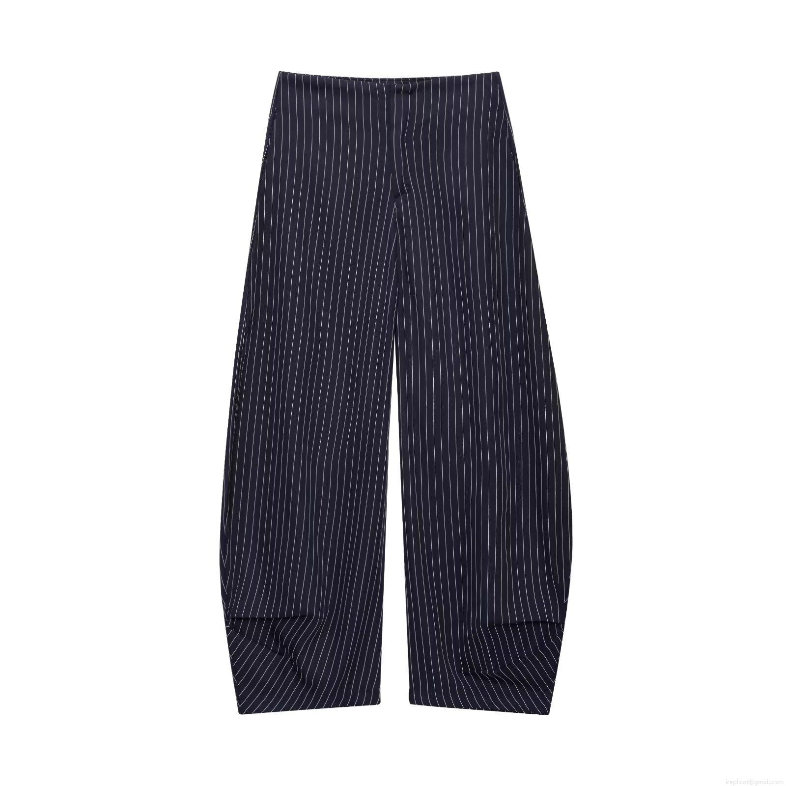 Women Navy Blue Striped Linen Blend Two Piece Set V-Neck Sleeveless Wrap Top and Wide Leg Balloon Pants Casual Streetwear Outfit
