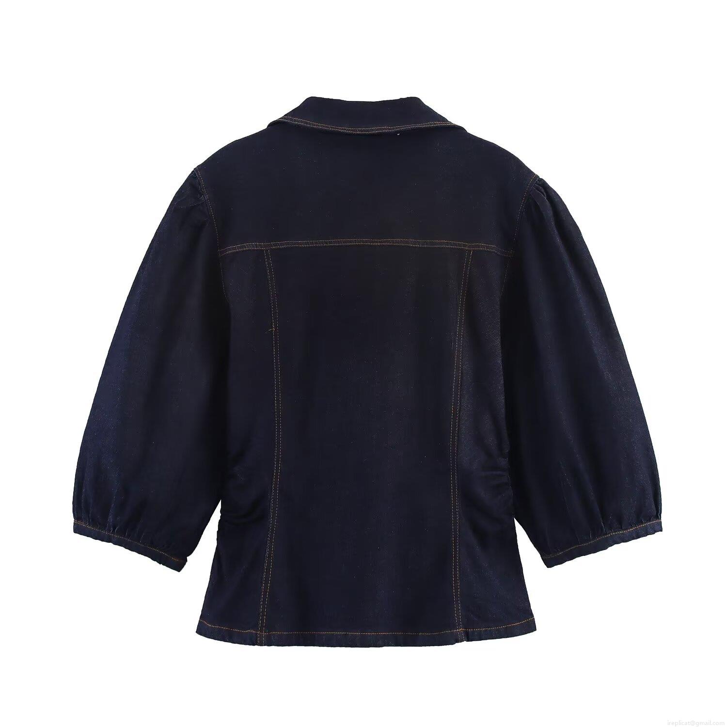 • Women Retro Denim Two Piece Outfit Set Puff Sleeve Button Down Shirt Top And Straight Leg Jeans Pants Contrast Stitching Streetwear Casual Set
