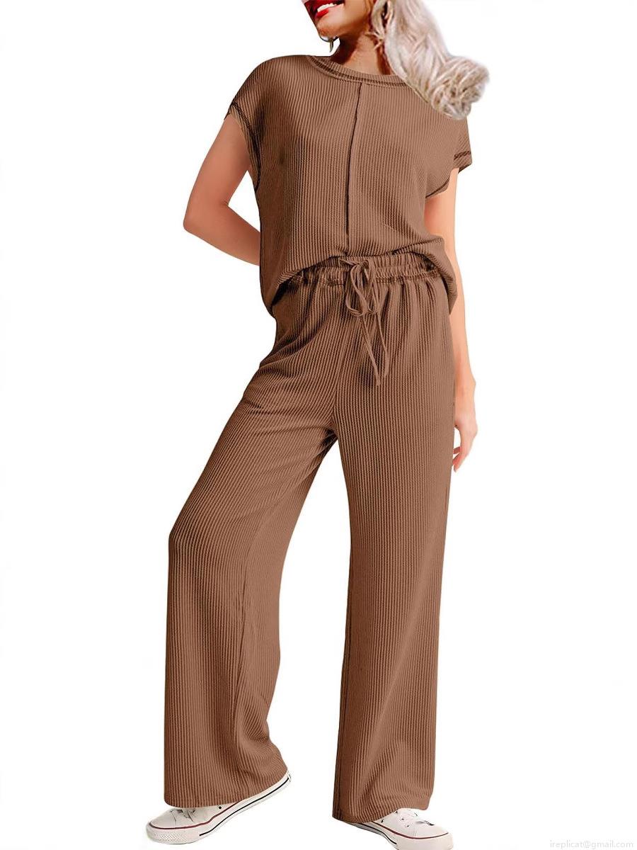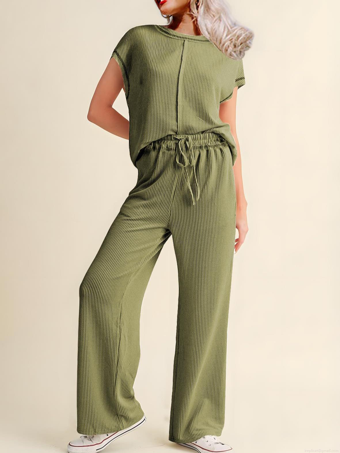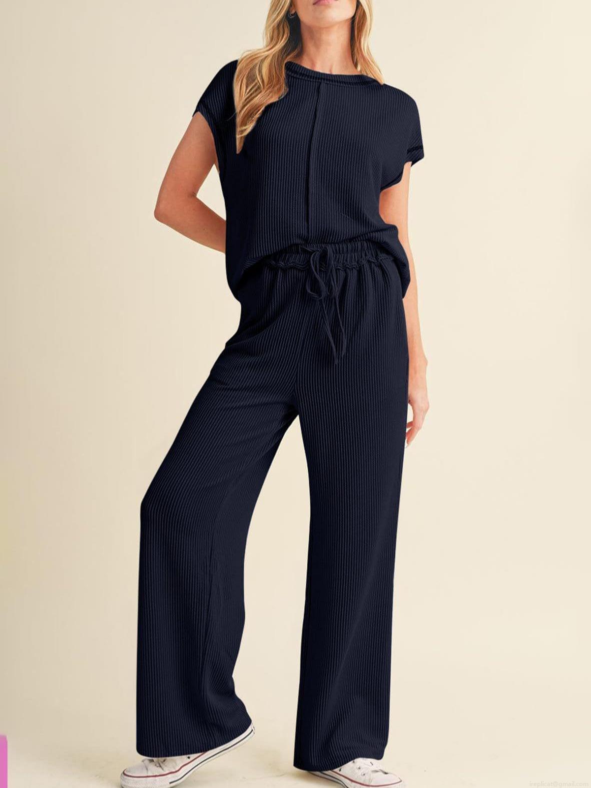 • Women Ribbed Knit Two Piece Pants Set Casual Short Sleeve Round Neck T-Shirt And High Waist Drawstring Wide Leg Trousers Comfortable Daily Commuting Loungewear Co-ords Outfits