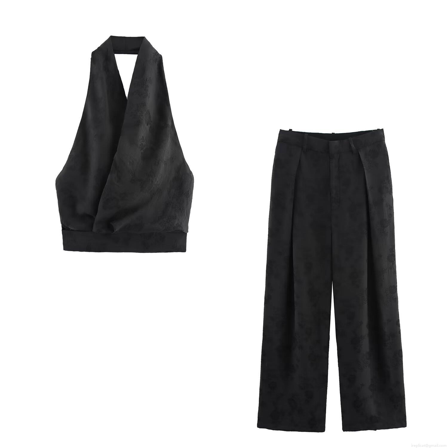 Women Sexy Jacquard Two Piece Set Halter Backless Crop Top And High Waist Wide Leg Pants Polyester Spandex Floral Pattern Elegant Party Outfits