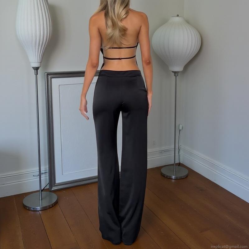 • Women Sexy Satin Two Piece Set Halter Backless Top And High Waist Wide Leg Pants Set Solid Color Chic Party Club Outfits For Women Night Out
