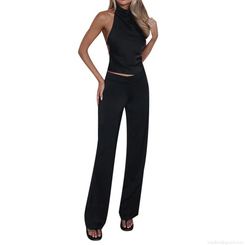 Solid Color, Satin, Neckband, Backless, Wide-leg, High-waisted