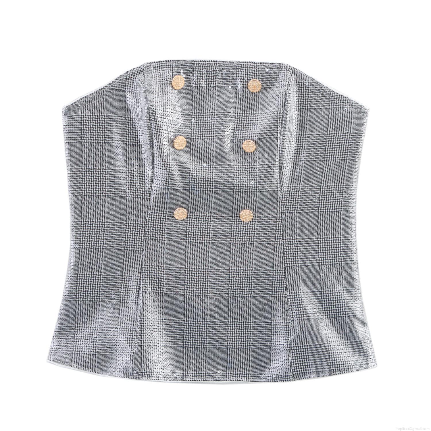 Houndstooth, Checkered Pattern, Metal Buckle, Sequin Decoration, Double-breasted, Strapless Design
