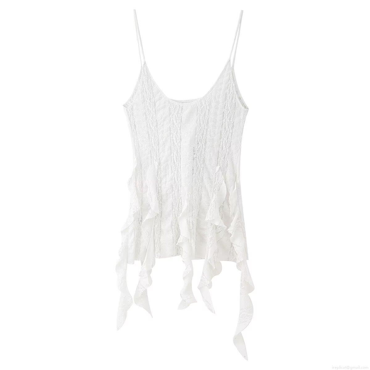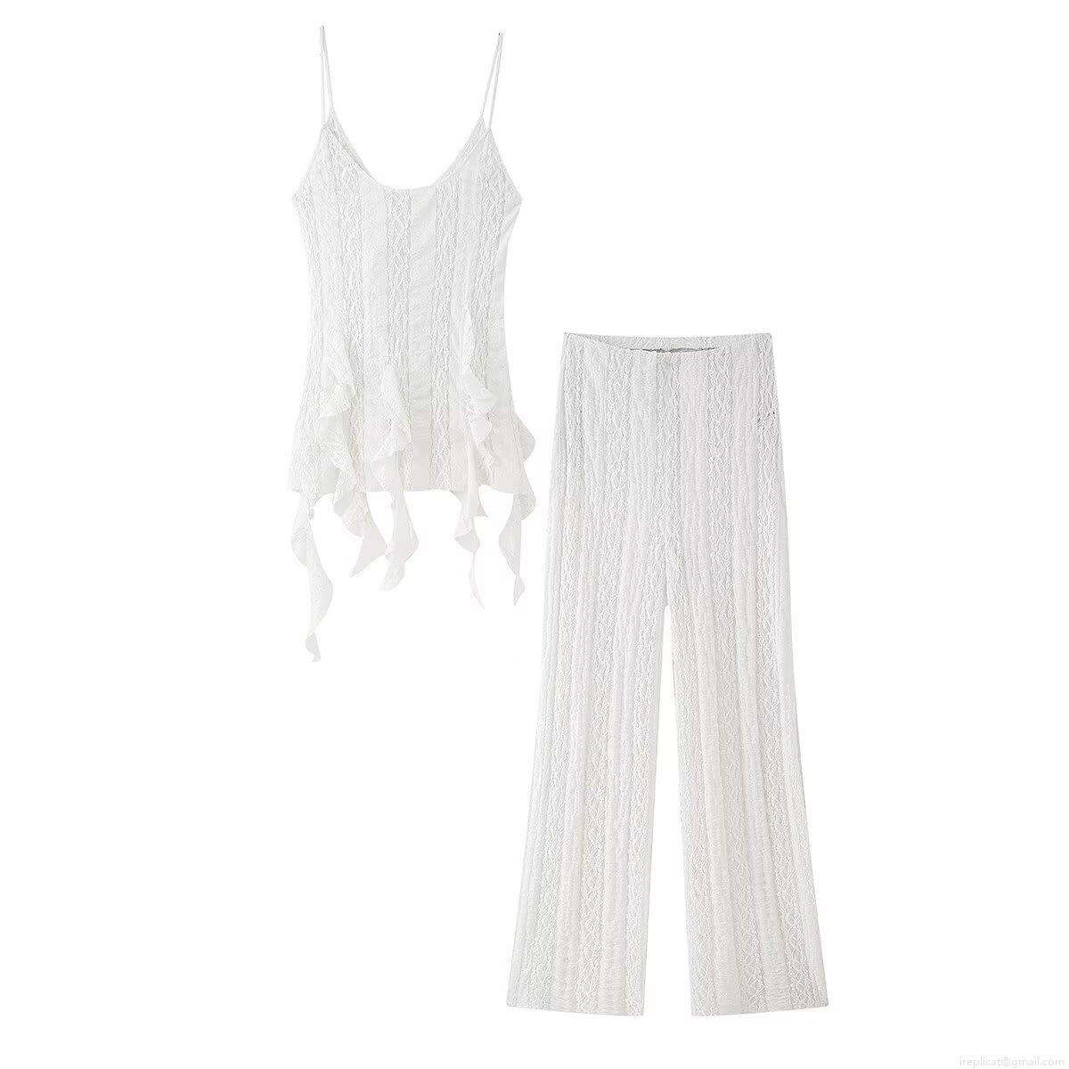 • Women Sexy White Lace Ruffle Camisole Top And High Waist Straight Leg Pants Fashion Summer Sleeveless Hollow Out Two Piece Set For Ladies Party Vacation