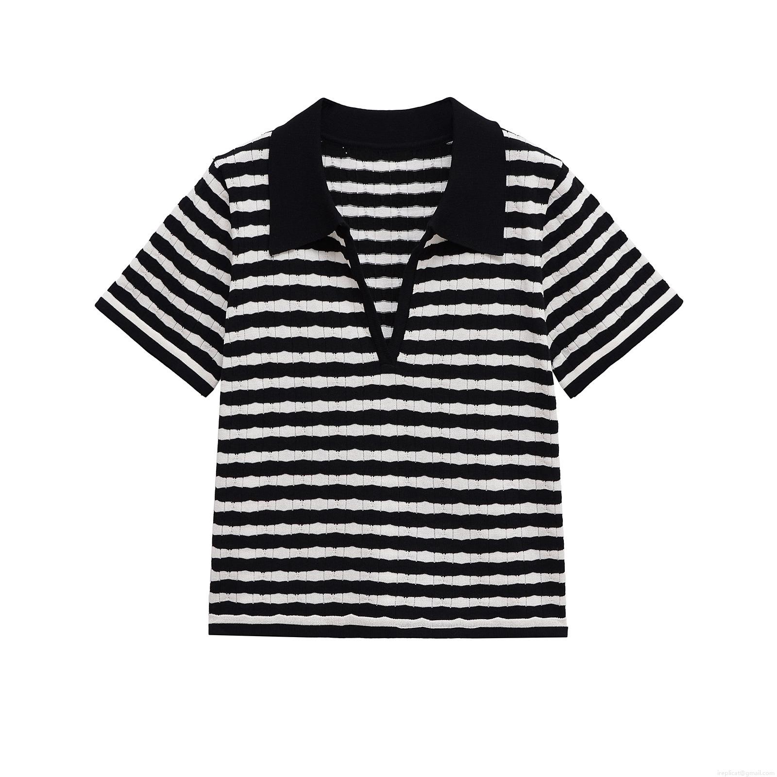 • Women Stripe Knitted Polo Short Sleeve Top and Flare Pants Two Piece Set Casual Streetwear Ribbed Cotton Blend Outfits High Waist Trousers