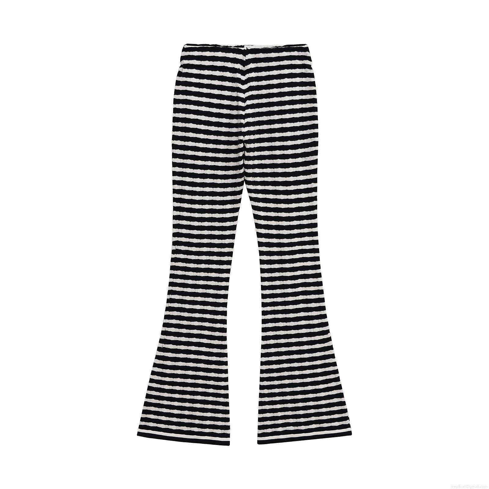 Women Stripe Knitted Polo Short Sleeve Top and Flare Pants Two Piece Set Casual Streetwear Ribbed Cotton Blend Outfits High Waist Trousers
