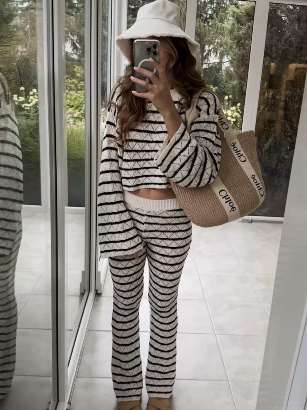 • Women Striped Knit Two Piece Set Long Sleeve Round Neck Crop Top And High Waist Flare Pants Streetwear Crochet Co-ords Autumn Winter Fashion