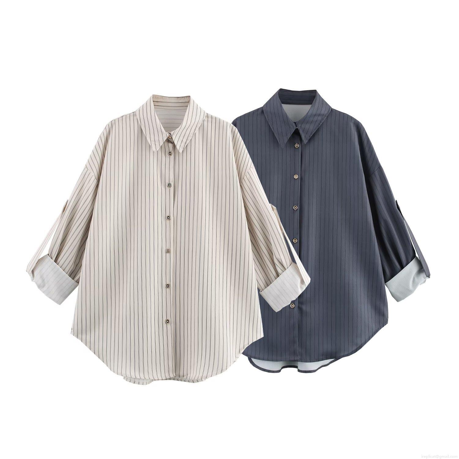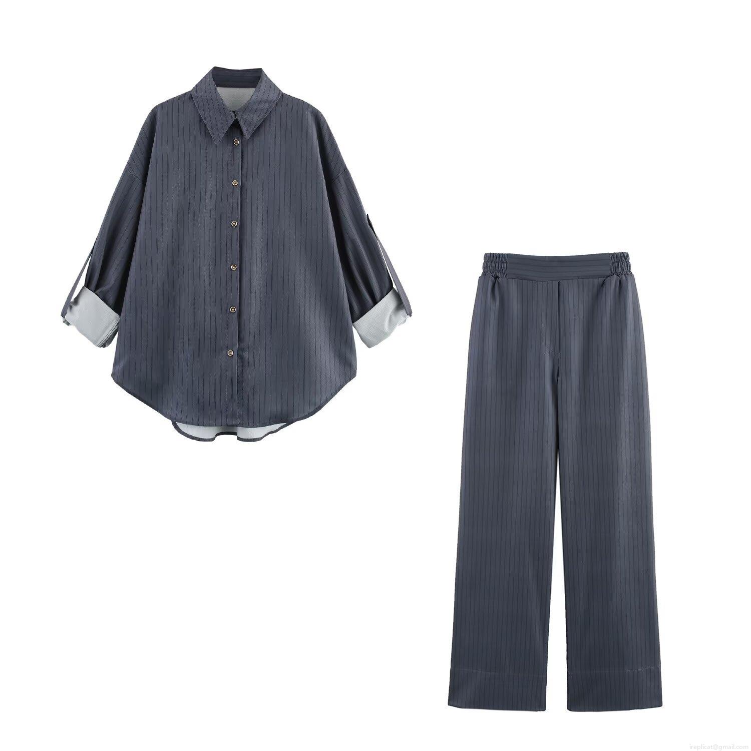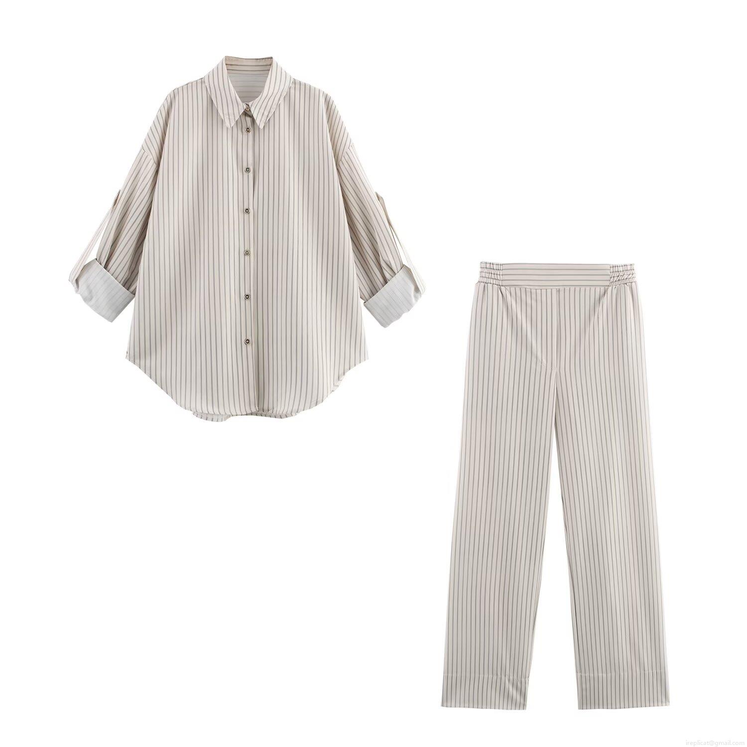 • Women Striped Long Sleeve Shirt And Wide Leg Pants Casual Polyester Two Piece Set Adjustable Sleeve Lapel Top High Waist Trousers Streetwear Daily Outfit