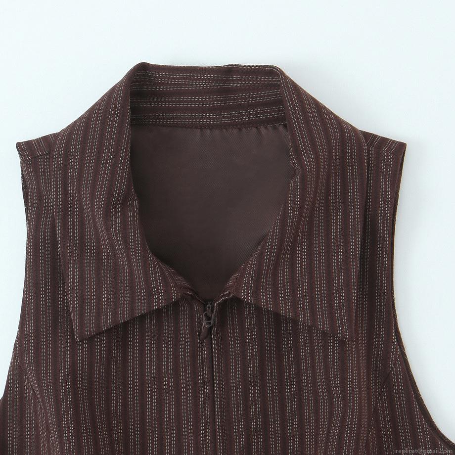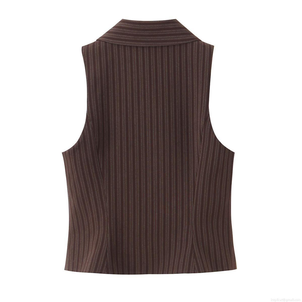 • Women Striped Sleeveless Vest And High Waist Wide Leg Pants Set Brown Zipper Lapel Top Straight Trousers OL Career Suits For Fall Winter