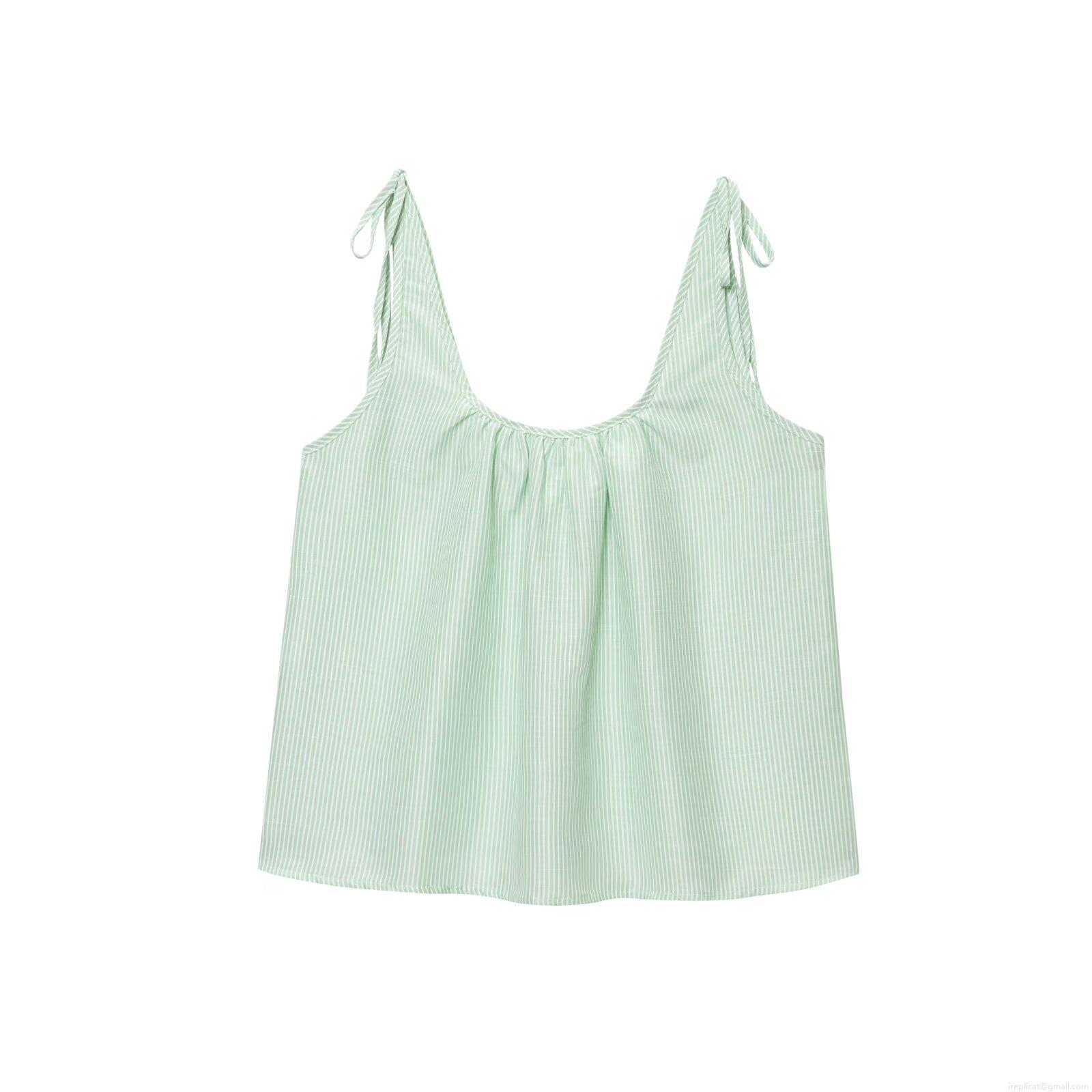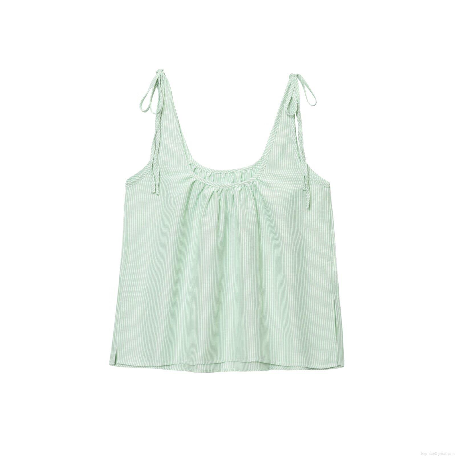• Women Summer Striped 2-Piece Outfit Mint Green Sleeveless Camisole Top And Wide Leg Pants Set Casual Cotton Linen Texture Set For Beach Vacation