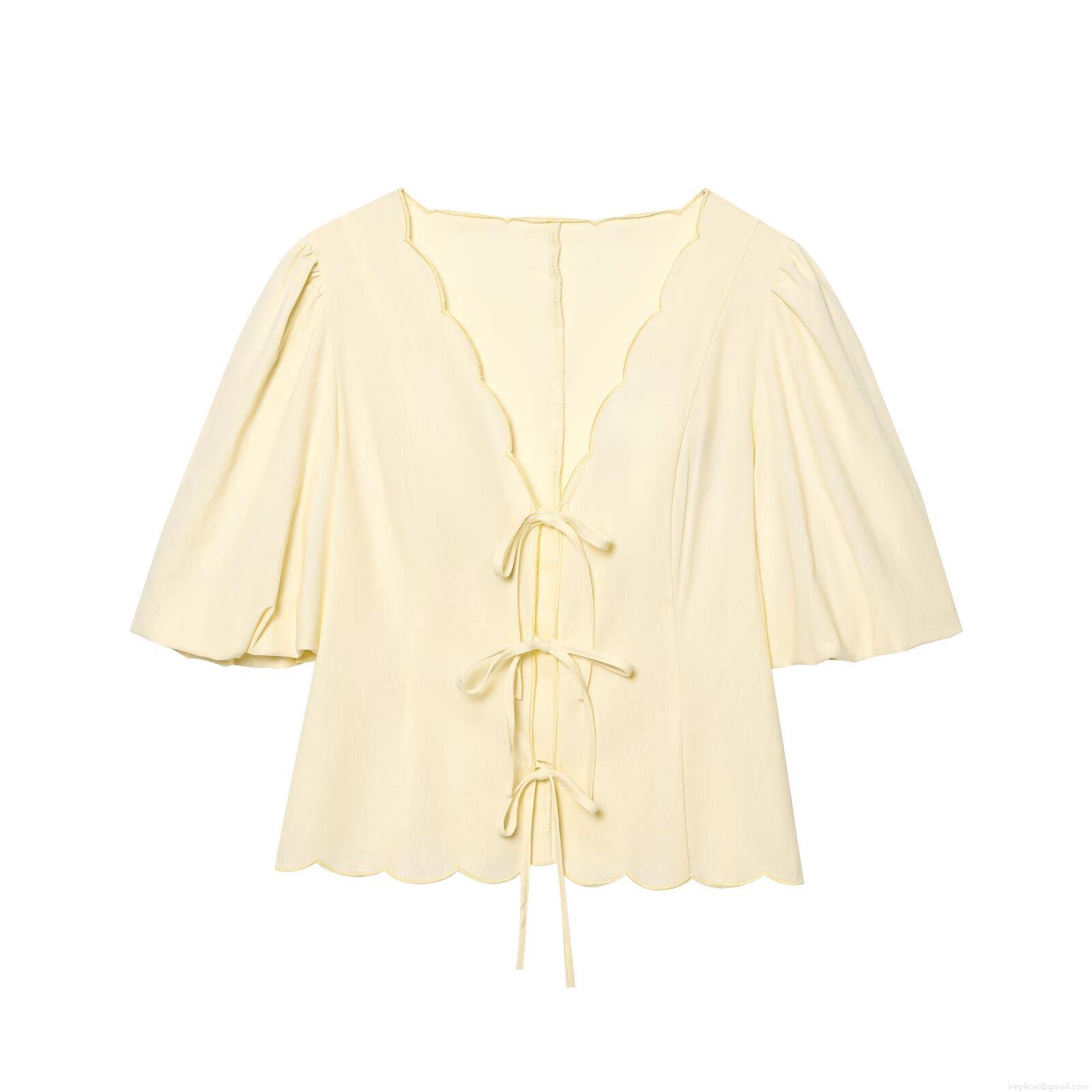Solid Color, Bow, Lace, Puff Sleeves, Wavy Edge, Wide-leg, Scallop Edge