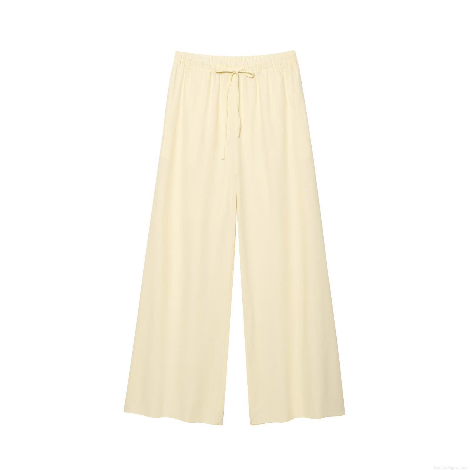 • Women Two Piece Set Scalloped Trim V Neck Tie Front Bubble Sleeve Top And High Waist Wide Leg Pants Casual Summer Polyester Streetwear Outfits