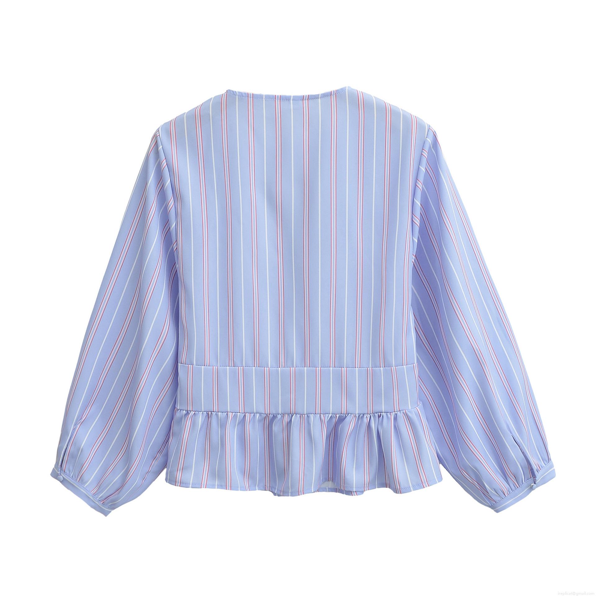 • Women Two Piece Set Sexy V Neck Bow Tie Striped Long Sleeve Blouse Top and High Waist Wide Leg Pants Polyester Summer Street Style Casual Outfits
