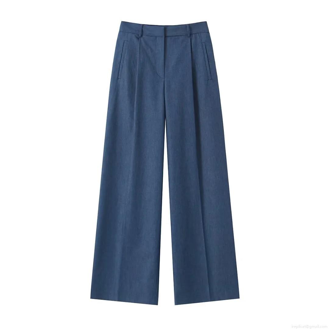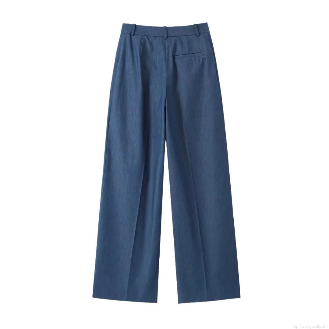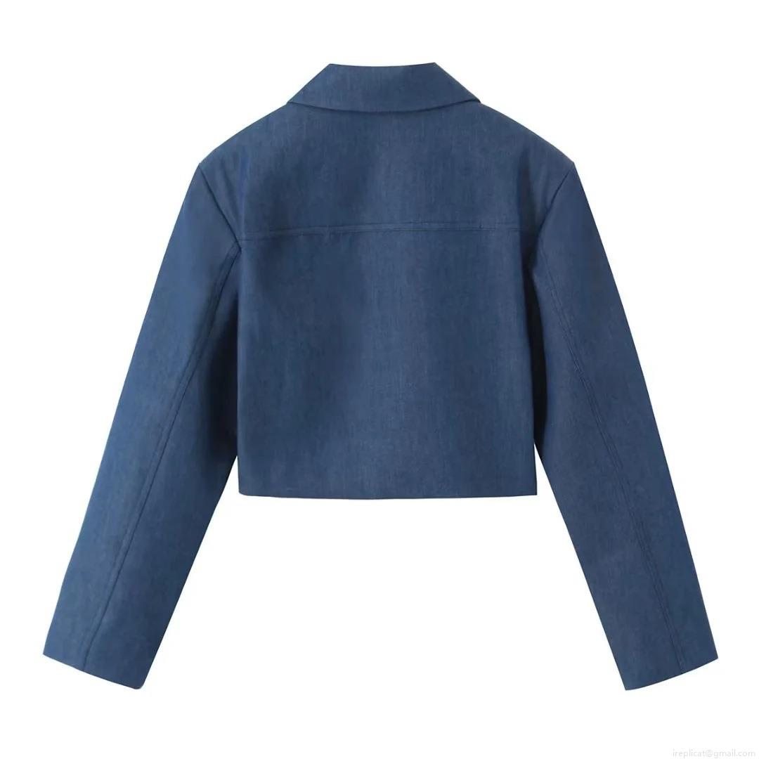 • Women Two Piece Set Solid Blue Denim Style Short Jacket And High Waist Wide Leg Pants Polyester Elegant Office Lady Streetwear Long Sleeve Outfit