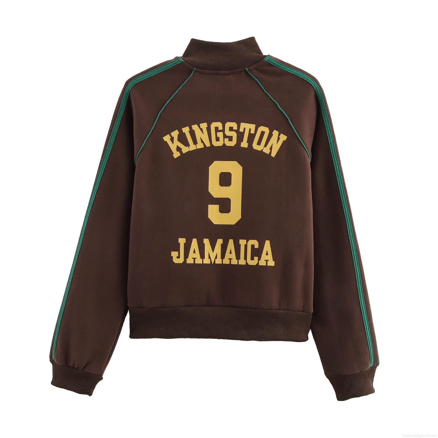 • Women Vintage Cotton Blend Tracksuit Set Retro Kingston Jamaica Print Zip Up Stand Collar Jacket And Side Stripe Wide Leg Pants Streetwear Casual Sports Outfit