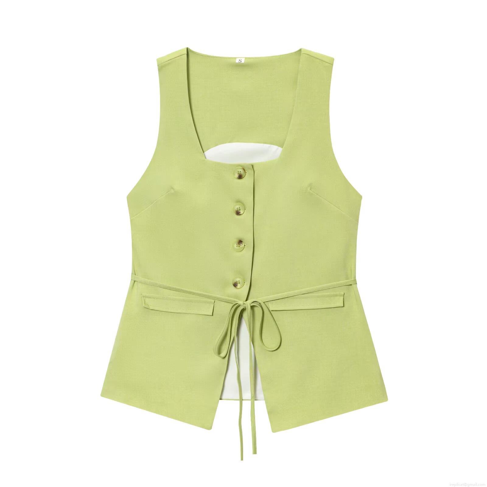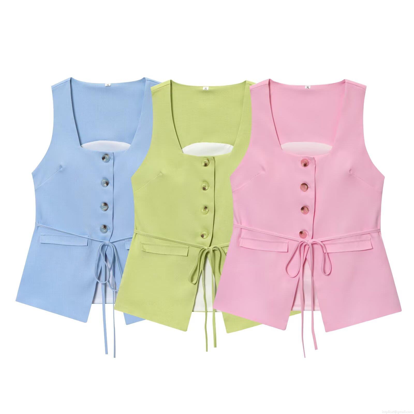 • Women Western Style 2-Piece Vest And Pants Set Polyester Solid Color Sleeveless Button Vest Tied Wide Leg Drawstring Trousers Casual Streetwear Outfits