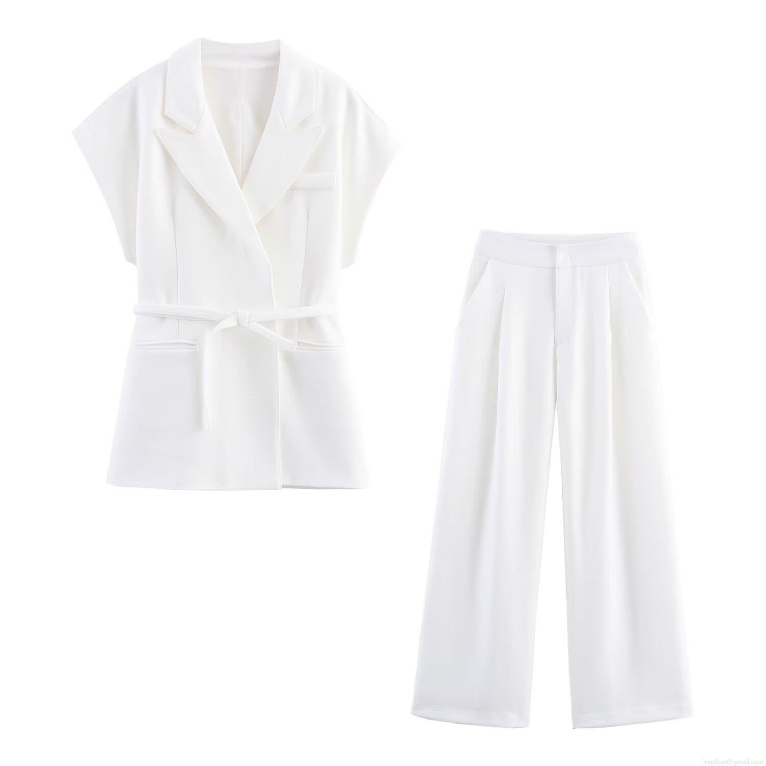 Women Western Style Sleeveless Vest With Belt And Wide Leg Pleated Pants Linen Blend Two Piece Casual Suit For Office White