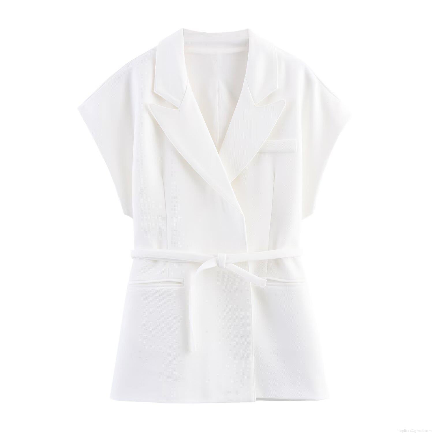 • Women Western Style Sleeveless Vest With Belt And Wide Leg Pleated Pants Linen Blend Two Piece Casual Suit For Office White