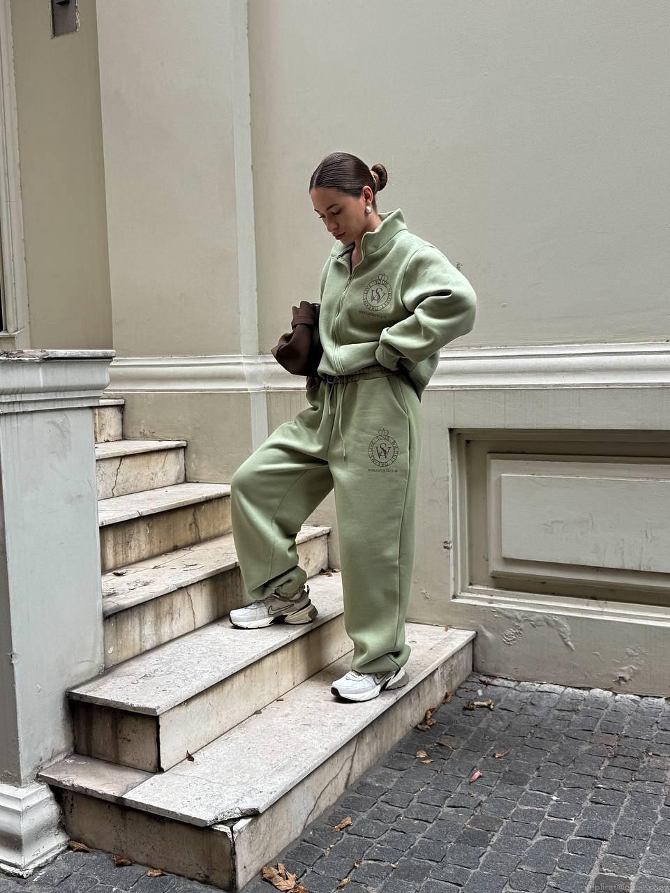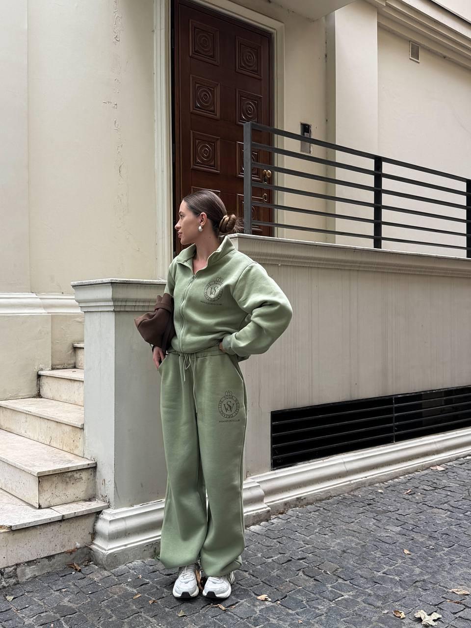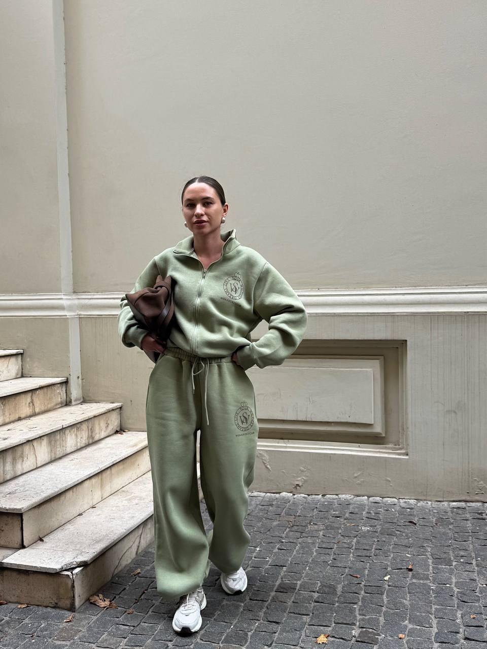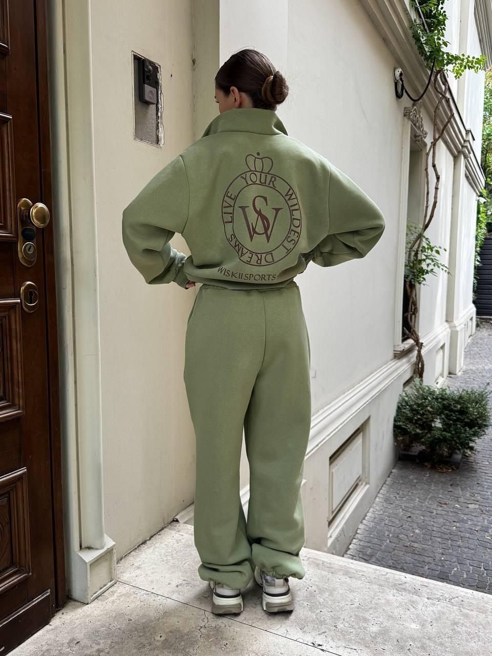 Women's 100% Cotton Casual Sports Set Sage Green Zipper Long Sleeve Sweatshirt And High Waist Sweatpants Letter Print Athleisure Two Piece Outfit