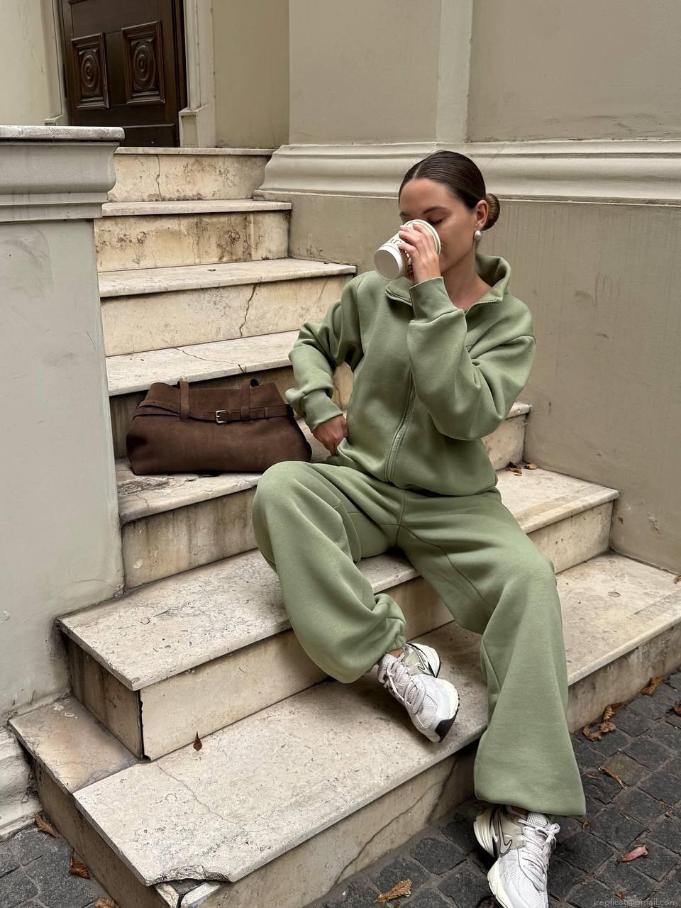 • Women's 100% Cotton Casual Sports Set Sage Green Zipper Long Sleeve Sweatshirt And High Waist Sweatpants Letter Print Athleisure Two Piece Outfit