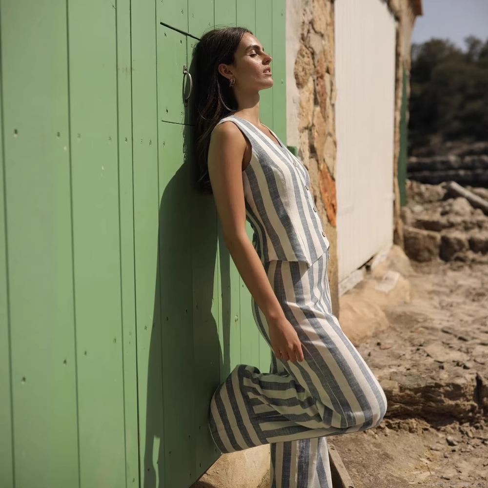 • Women's 100% Polyester Striped Two Piece Set V Neck Sleeveless Vest And High Waist Wide Leg Pants Summer Casual Vacation Outfit