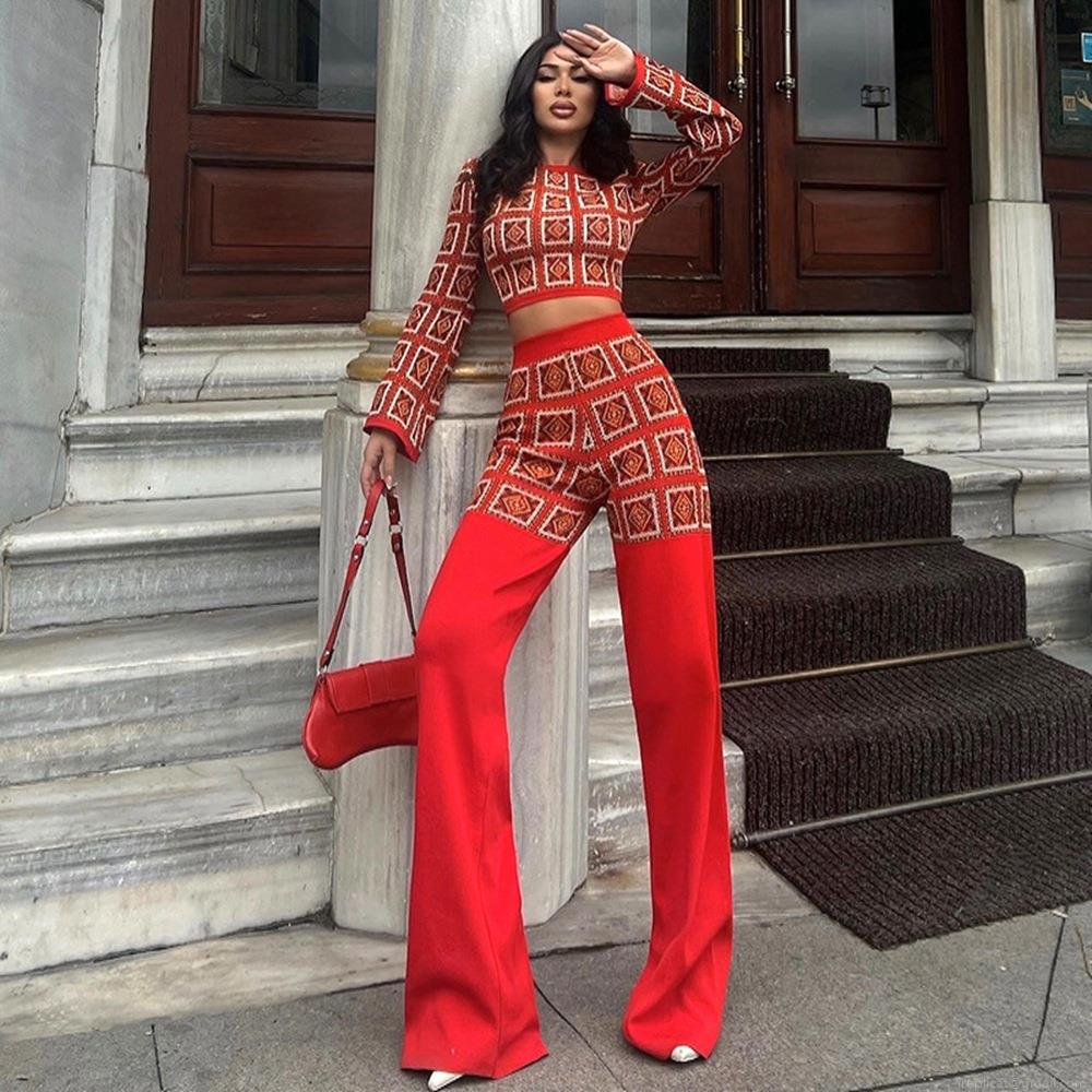 • Women's 2 Piece Geometric Print Pants Set Long Sleeve Crop Top And High Waisted Wide Leg Trousers Polyester Spandex Retro Ethnic Style Casual Outfits