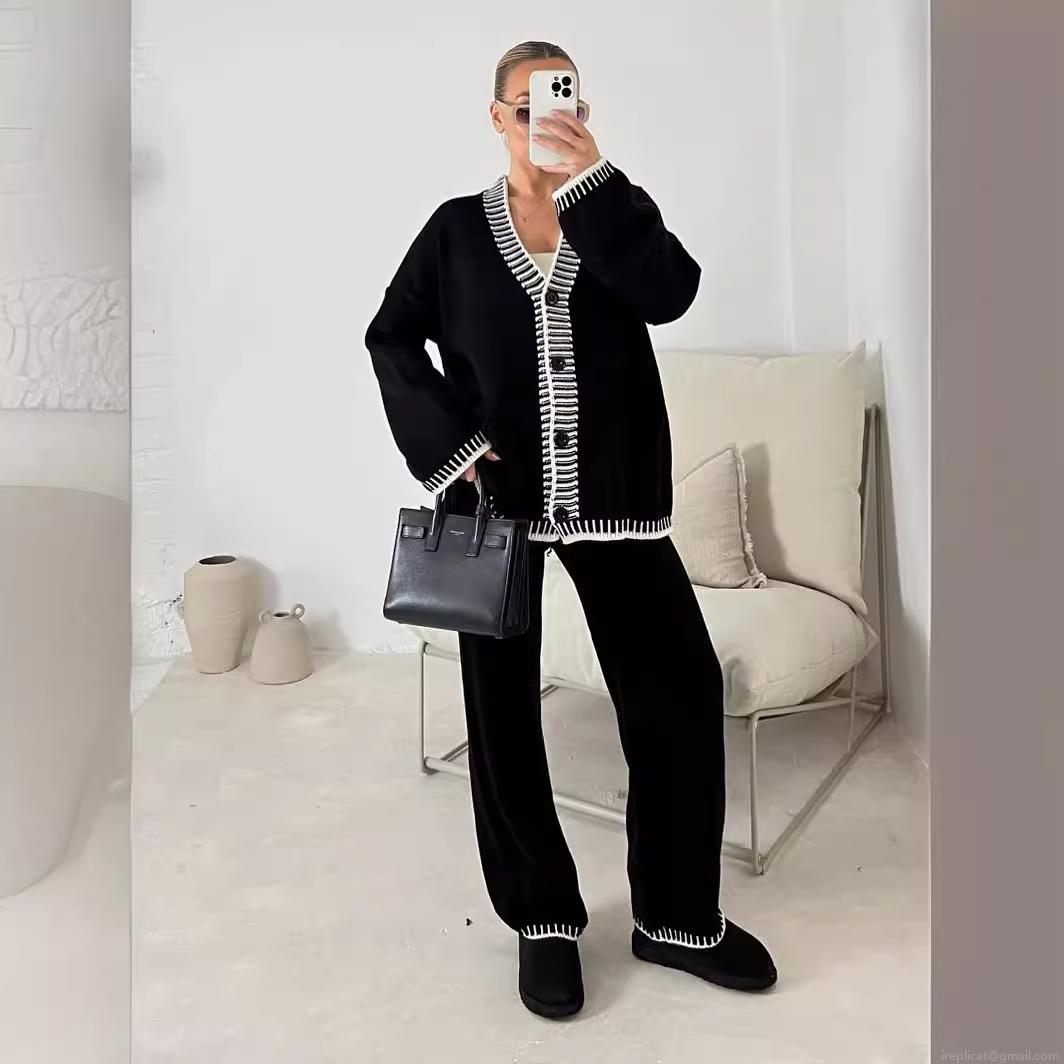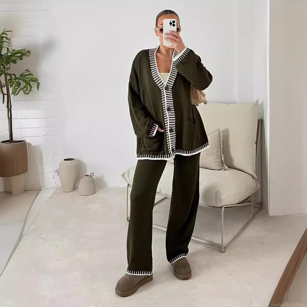 • Women's 2 Piece Knit Set V Neck Single Breasted Cardigan and Wide Leg Pants Contrast Stitching Casual Loungewear Outfits