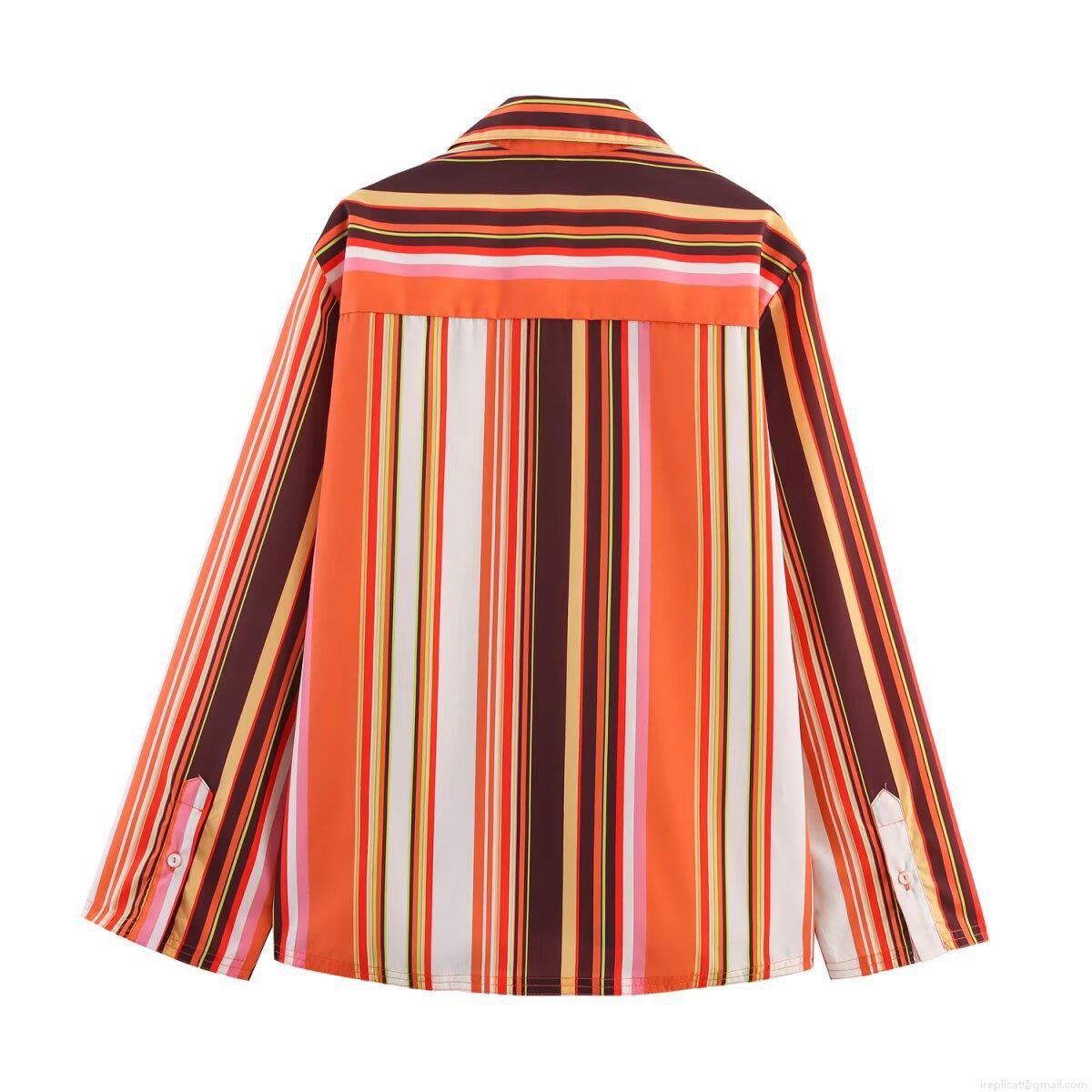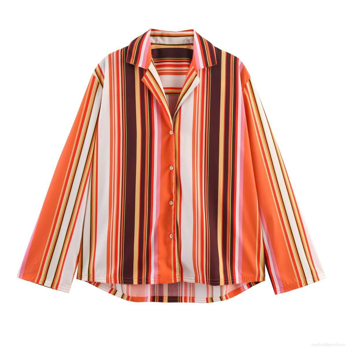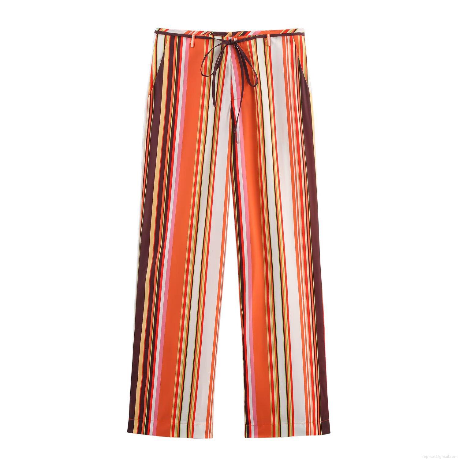 • Women's 2 Piece Outfit Set Polyester Multi-color Vertical Stripe Long Sleeve Button Down Shirt And Drawstring Straight Leg Pants Casual Streetwear
