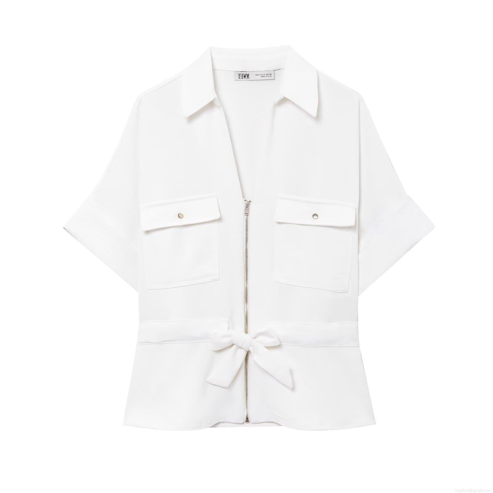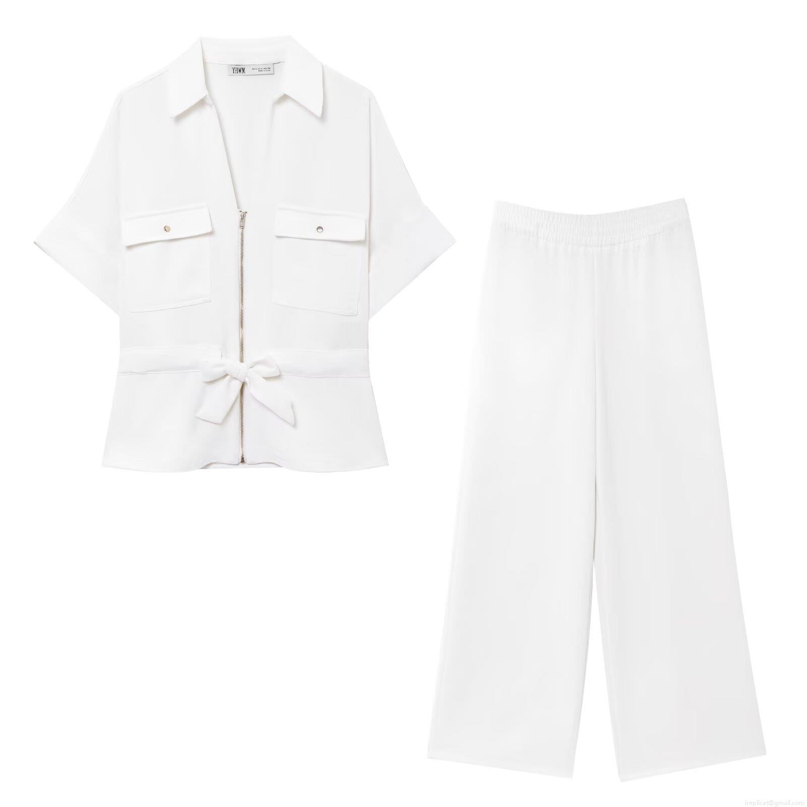 • Women's 2 Piece Outfits Casual Crepe Fabric Set Short Sleeve Zipper Lapel Top With Belt And High Waist Wide Leg Pants Streetwear Summer Outfits For Women