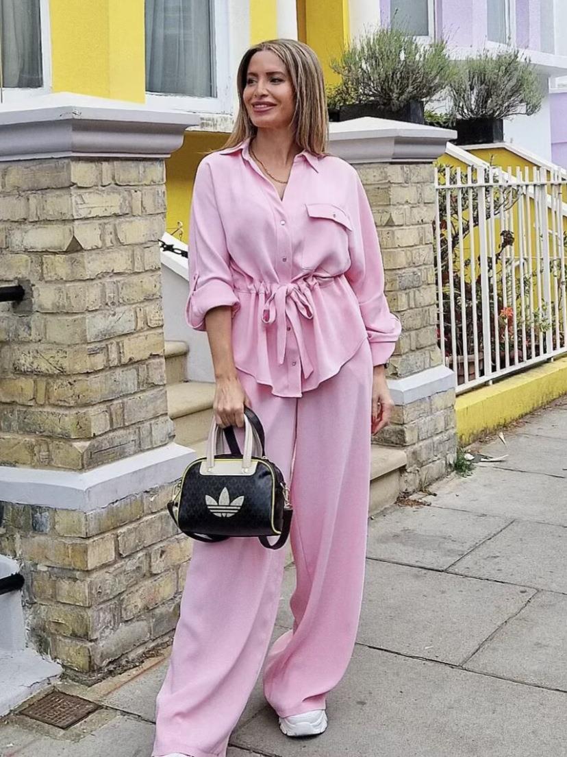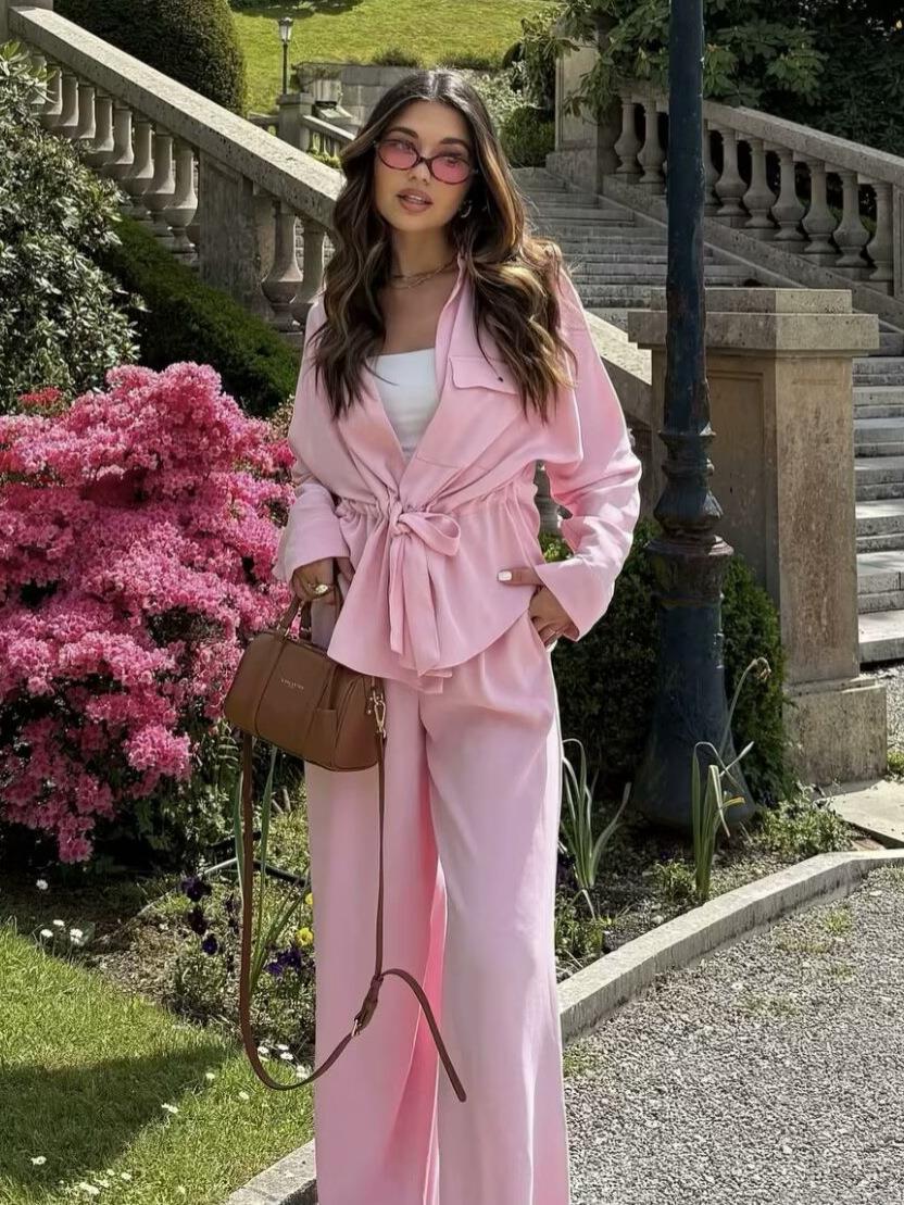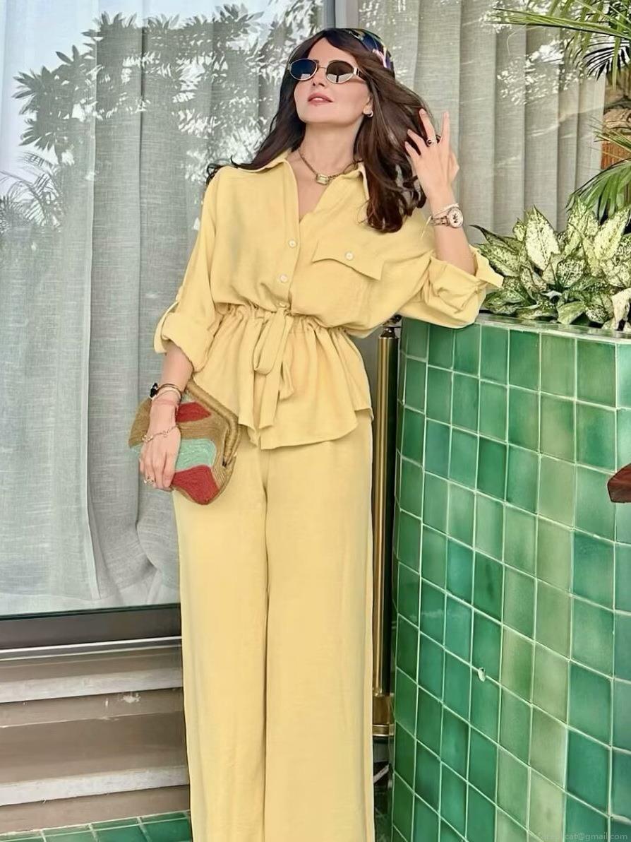 • Women's 2 Piece Outfits Casual Long Sleeve Button Down Shirt and High Waist Wide Leg Pants Set Summer Solid Color Streetwear Set for Women