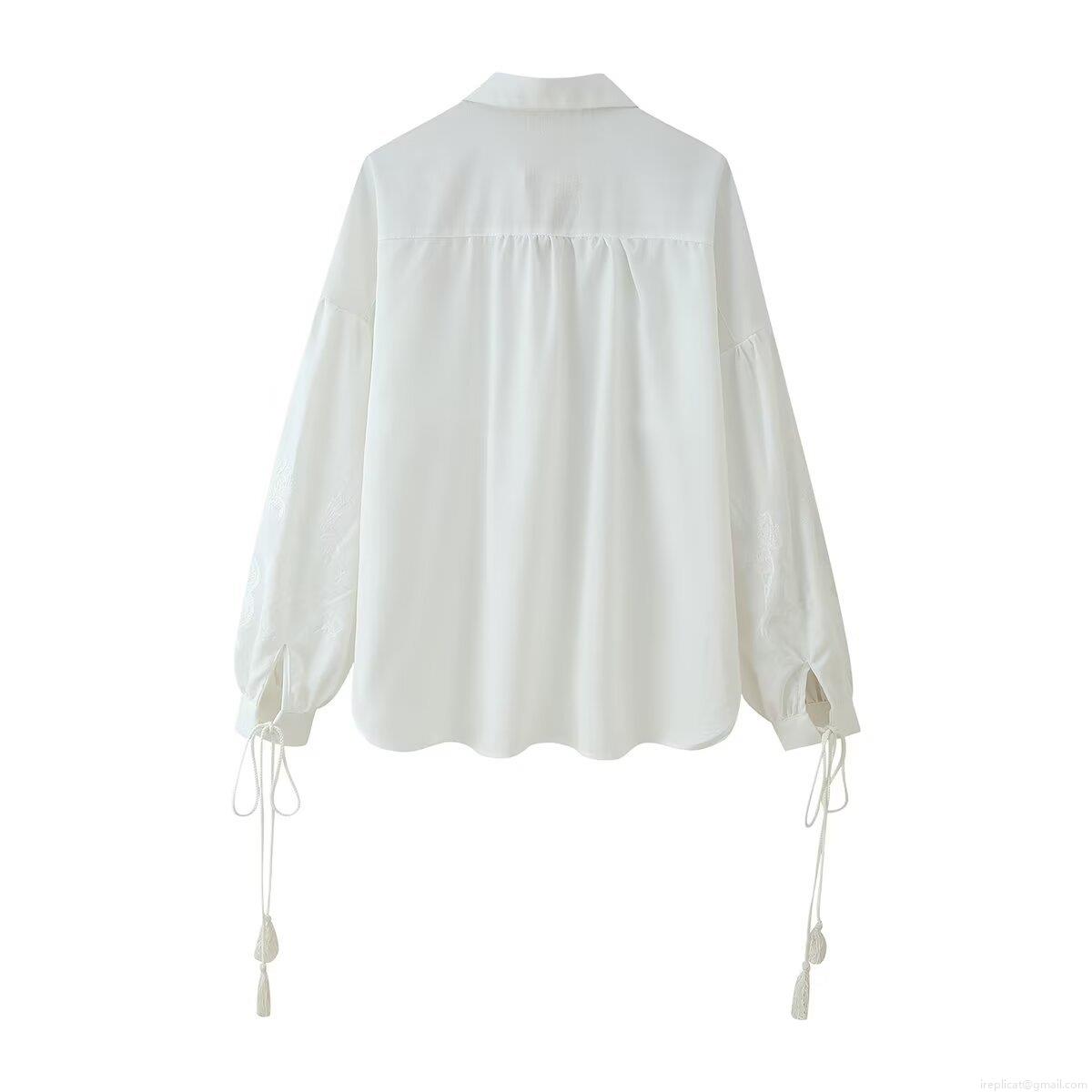 • Women's 2 Piece Outfits Cotton Linen Blend Embroidered Long Sleeve Shirt And Wide Leg Pants Boho Tassel Drawstring Casual Vacation Outfits